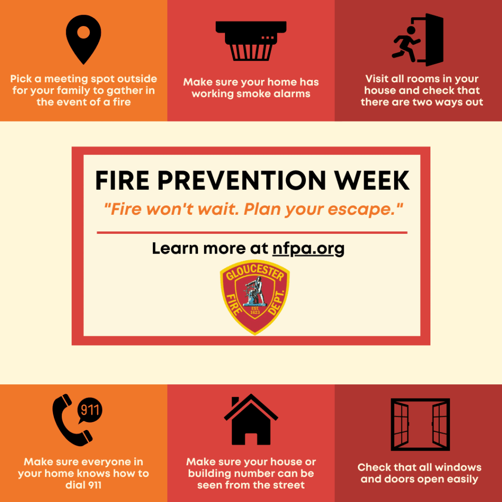 | To learn more about Fire Prevention Week, or to speak to your local Fire Prevention officers about steps you can take to protect your family, contact Gloucester Fire at the non-emergency line (978) 281-9760 or contact the Fire Prevention Bureau at (978) 325-5300 option 2. |
