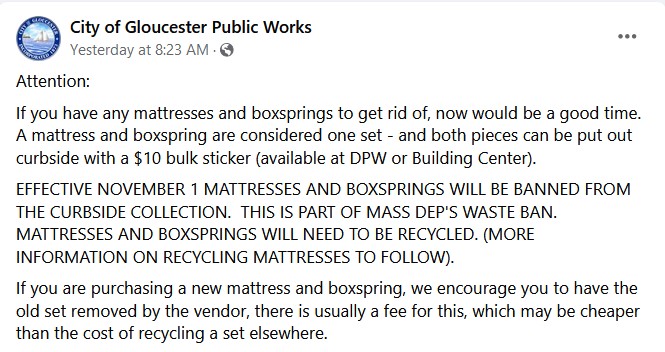 Sharing timely information from the Gloucester DPW regarding the disposal of mattresses and box springs. November 1 is around the corner!