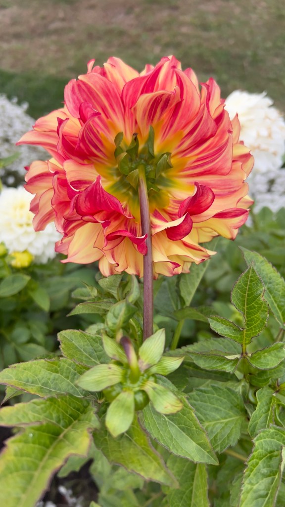 Last week, on a blustery morning I spotted this dahlia along the harbor walk in Gloucester but the name was missing. As you van see, I was only able to get a rear view, but even that was gorgeous. I would like to know its name.