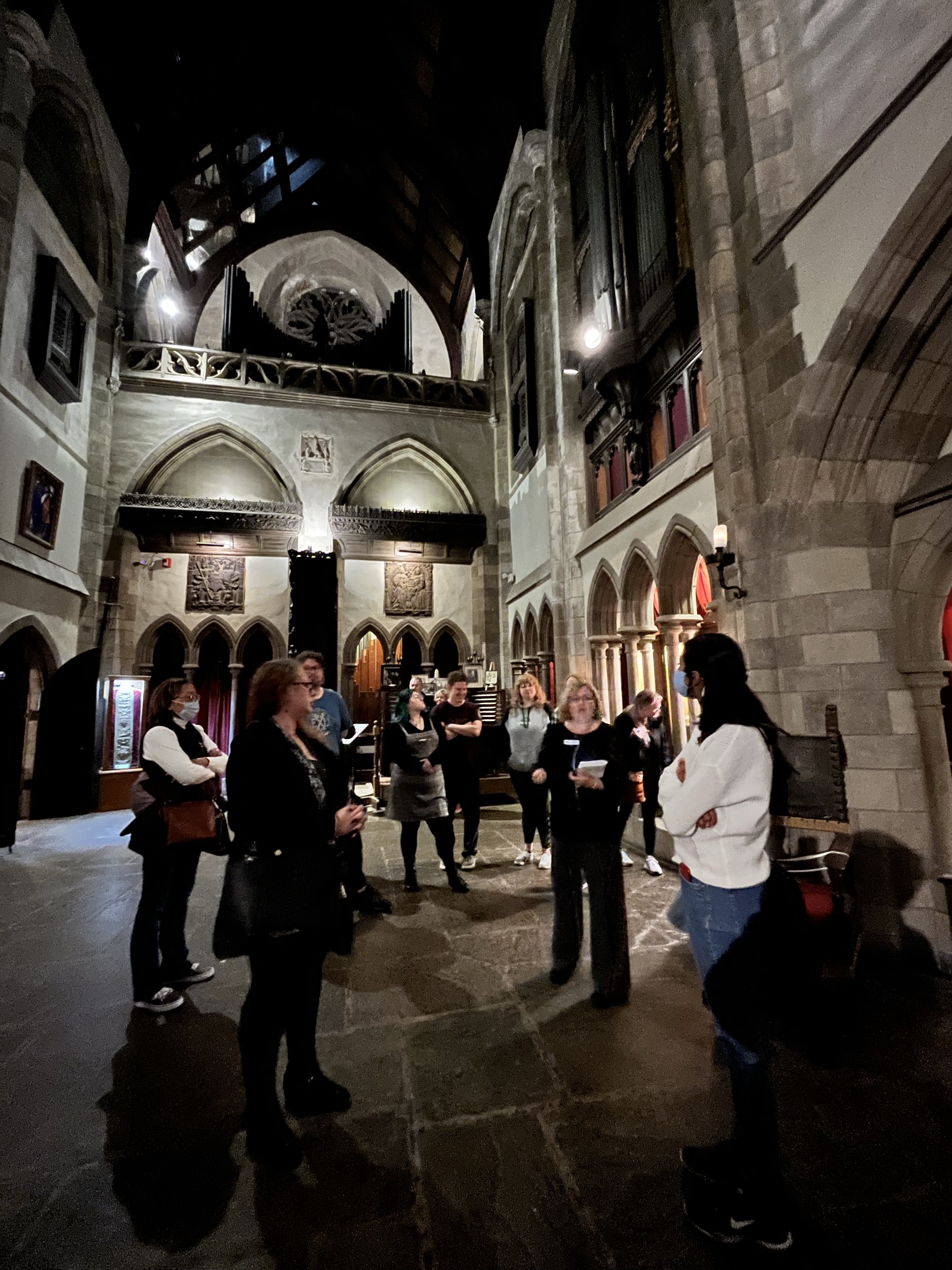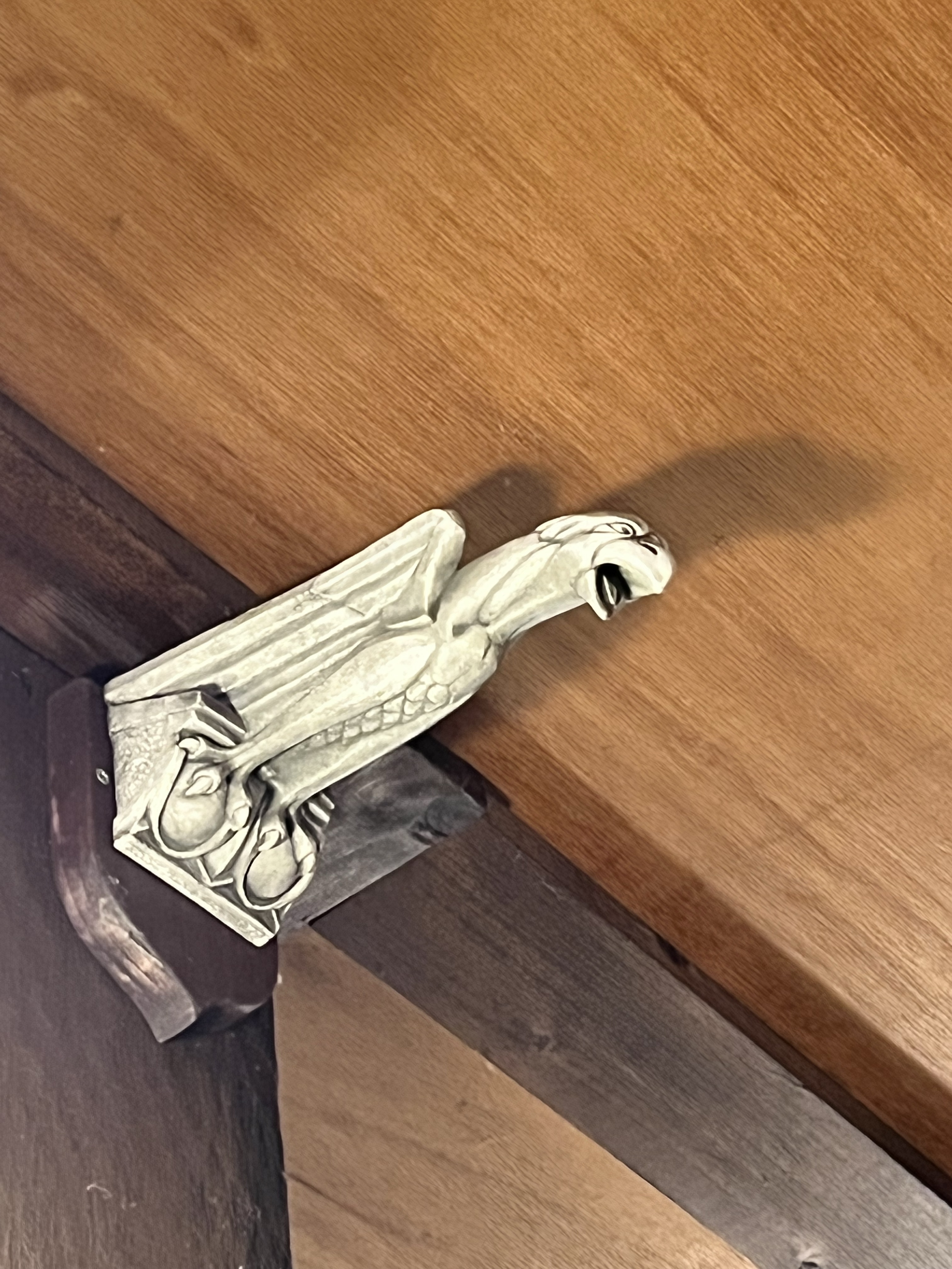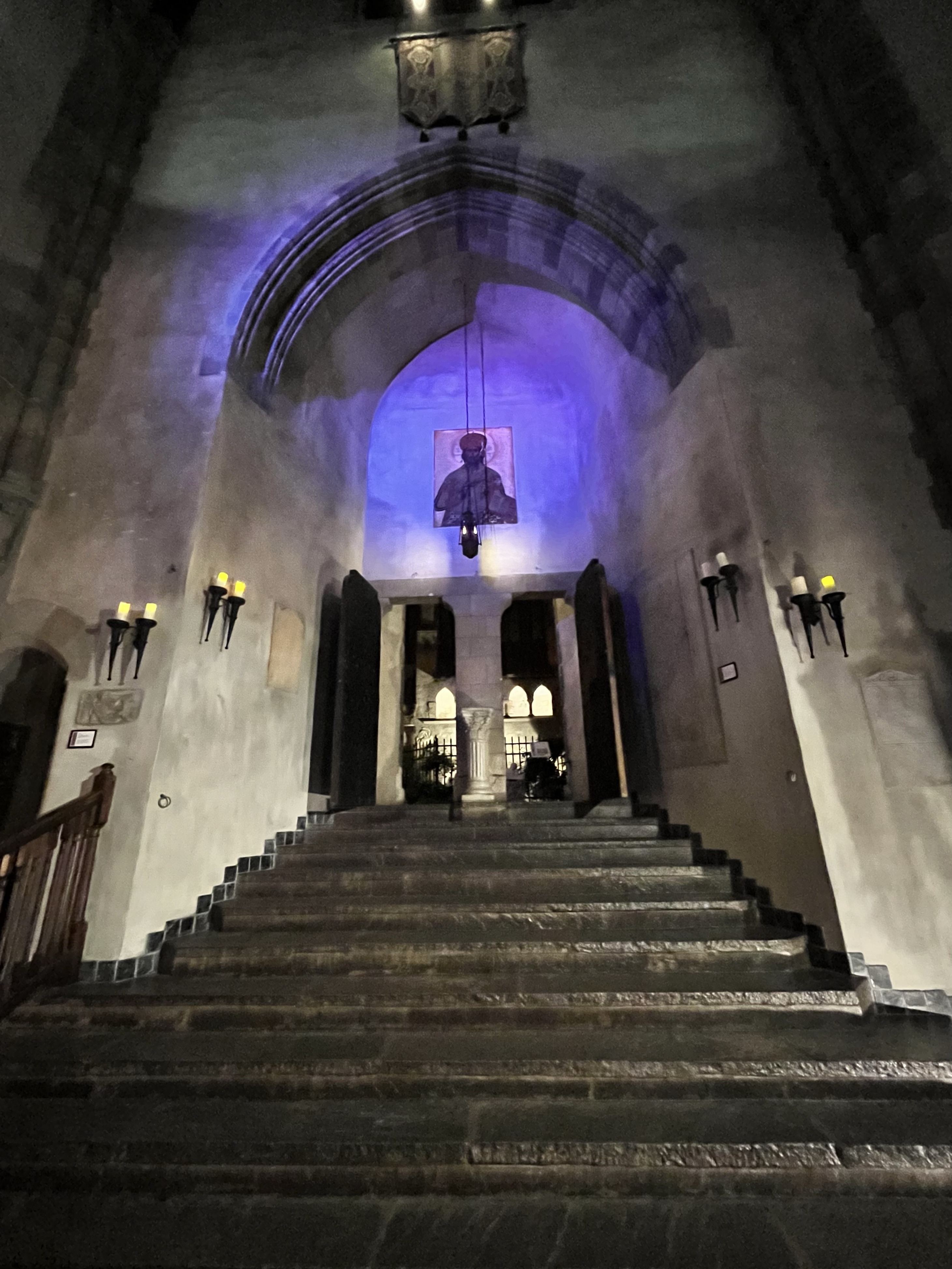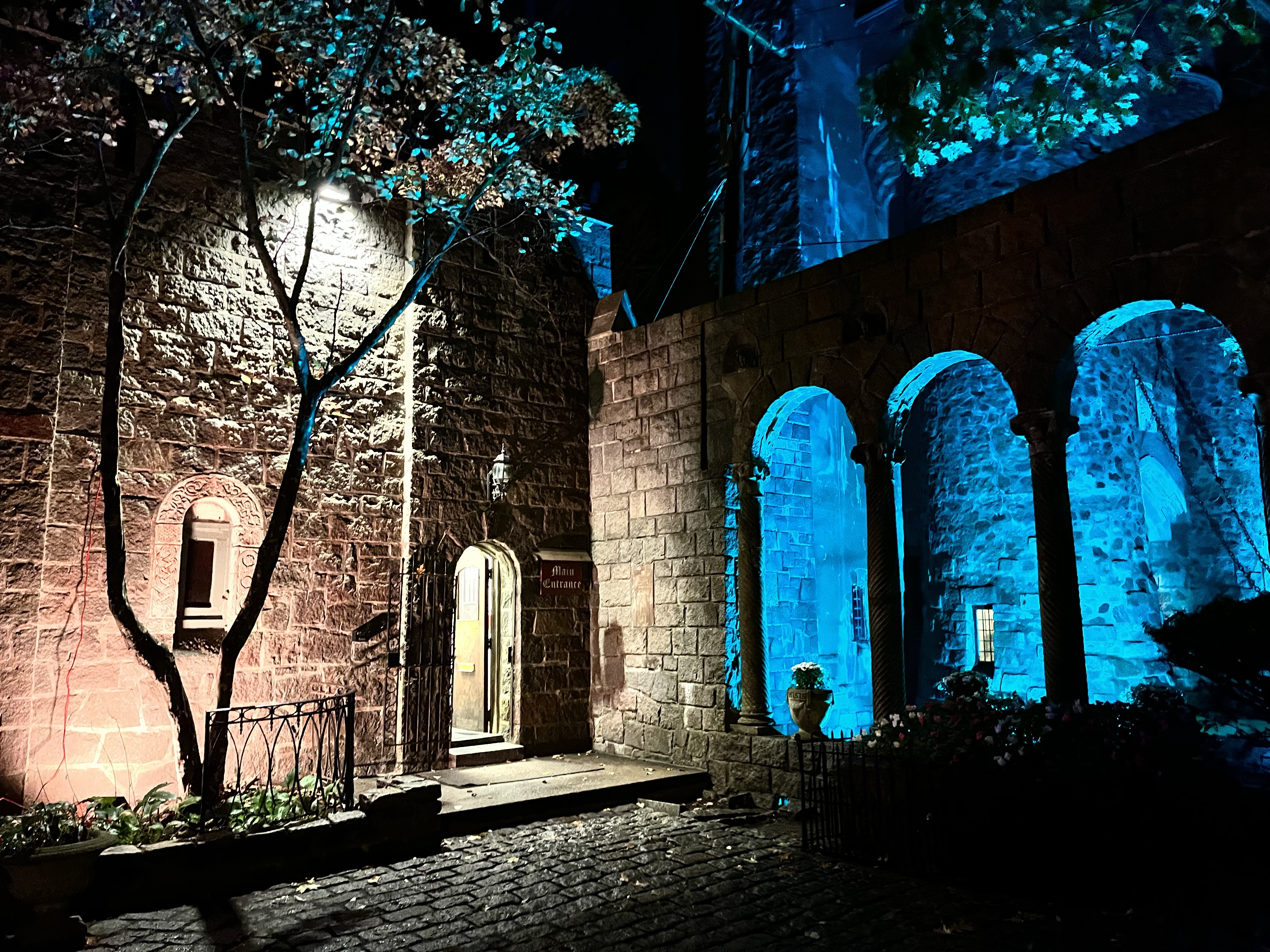 I was invited to visit Hammond Castle on Magnolia Ave and decided the Spiritualism Specialty Tour might be interesting for me. It was a (classic) dark and stormy night last Thursday when I joined about 15 other people for the tour to discuss the Spiritualism movement and the Hammond connections to the period in history. Lori and Caleb were the tour guides and each presented interesting factual accounts of the history of the movement and the Hammonds’ interest in it. It was a fairly academic presentation–not frivolous in nature. We moved slowly through the rooms in the castle on the hour long tour taking note of artifacts and stories connected to spiritualism. No hauntings, but ghostly moody lighting enhanced the experience. There are little-noticed details everywhere, so look up if you go. These tours are held on Thursday evenings in October so time is running out if this is something you might be interested in. Tickets and information available here. It’s an interesting way to spend a Thursday evening in October!