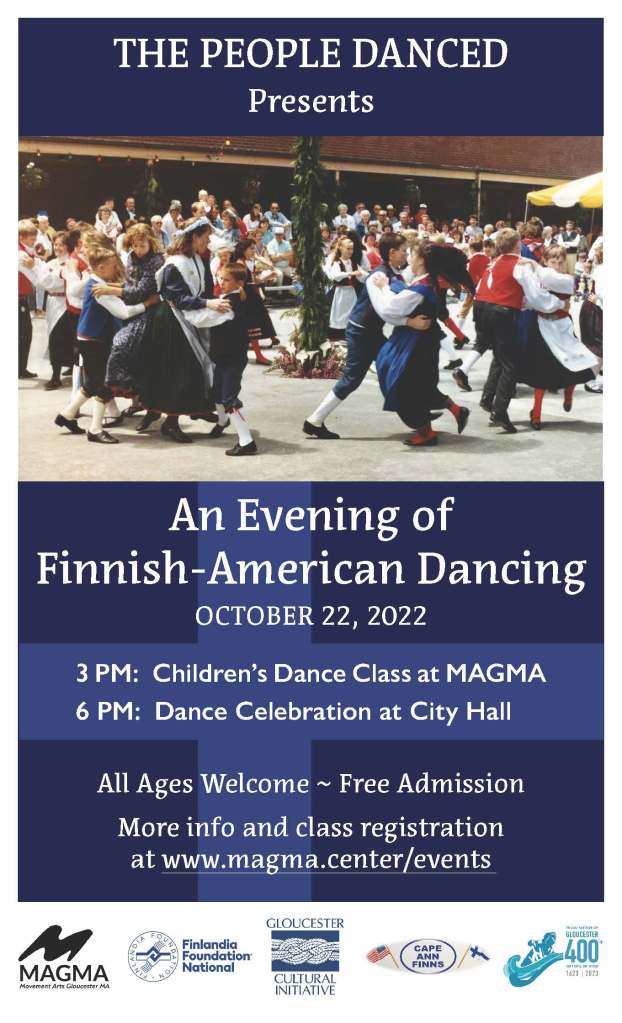 6 pm Dance Celebration at Gloucester City Hall, 9 Dale Ave. – for all ages with dance instruction from Leila Luopa, live music from Christine Anderson and Oivan Ilo, performances, refreshments, and more! No registration required.