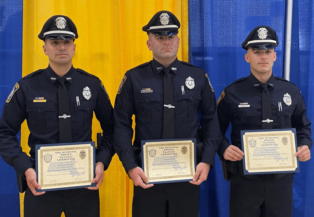 | Officers Andrew Marques, Aaron Aiello and Noah Aiello graduated on Friday, Oct. 7 from the Northern Essex Community College Police Academy, while Officer Dylan Snell was already academy trained and transferred to Gloucester Police from Gordan College Police. |