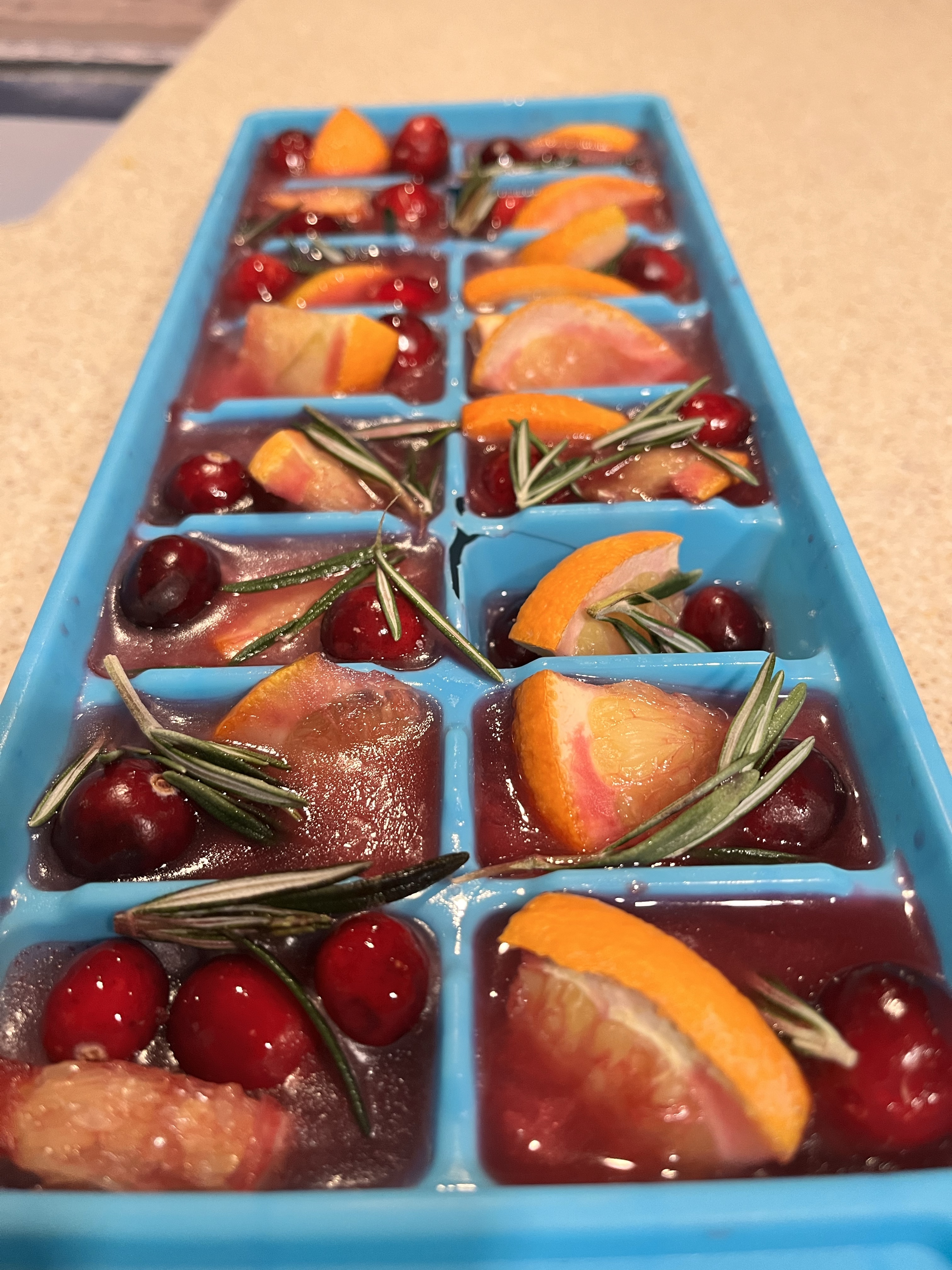 I make ice cubes out of cranberry pomegranate juice using orange chunks, rosemary springs and fresh cranberries. These ice cubes are festive and tasty in the Spritz drink. I call it Itsy Bitsy Ritzy Spritz just to amuse myself. I’m sure they would liven up most drinks that need a little ice.