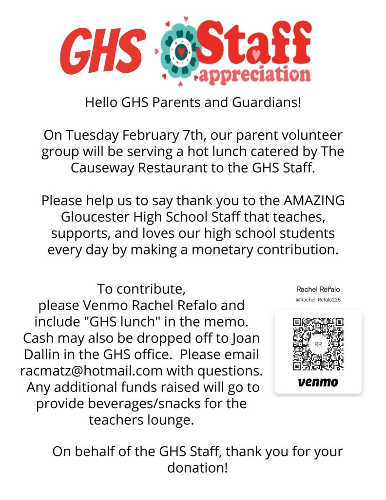 GHS parents! Please help our parent group say thank you to the amazing staff at GHS for their hard work and dedication to our students by contributing to this luncheon! Contributions can be sent to me via venmo or cash can be dropped off to Joan Dallin in the main office. The GHS staff thanks you! Please share to any GHS parent pages!!
