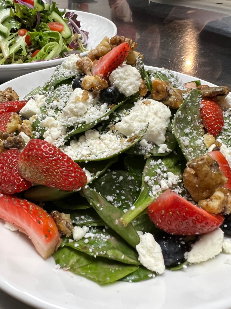 ◦ strawberry vinaigrette salad- marcona almonds, served with house made spinach, strawberries, blueberries, feta, sliced Spring Strawberry