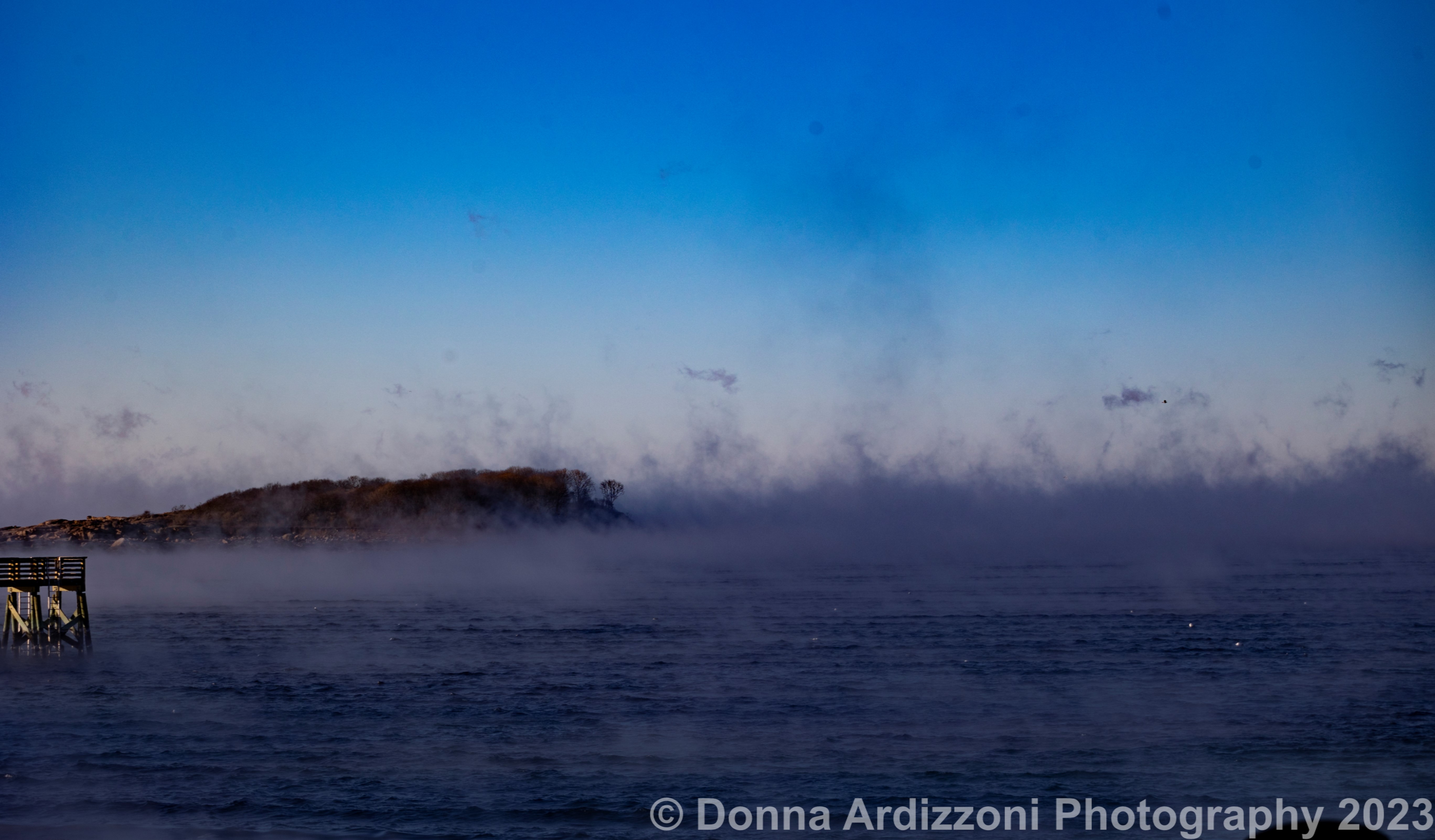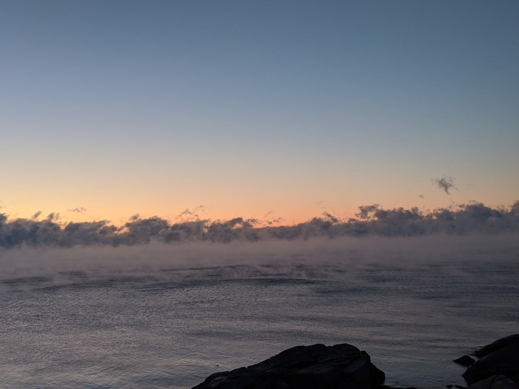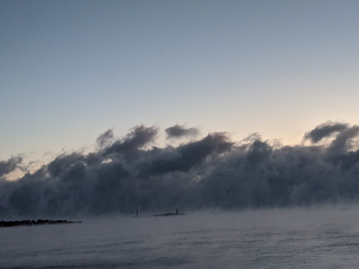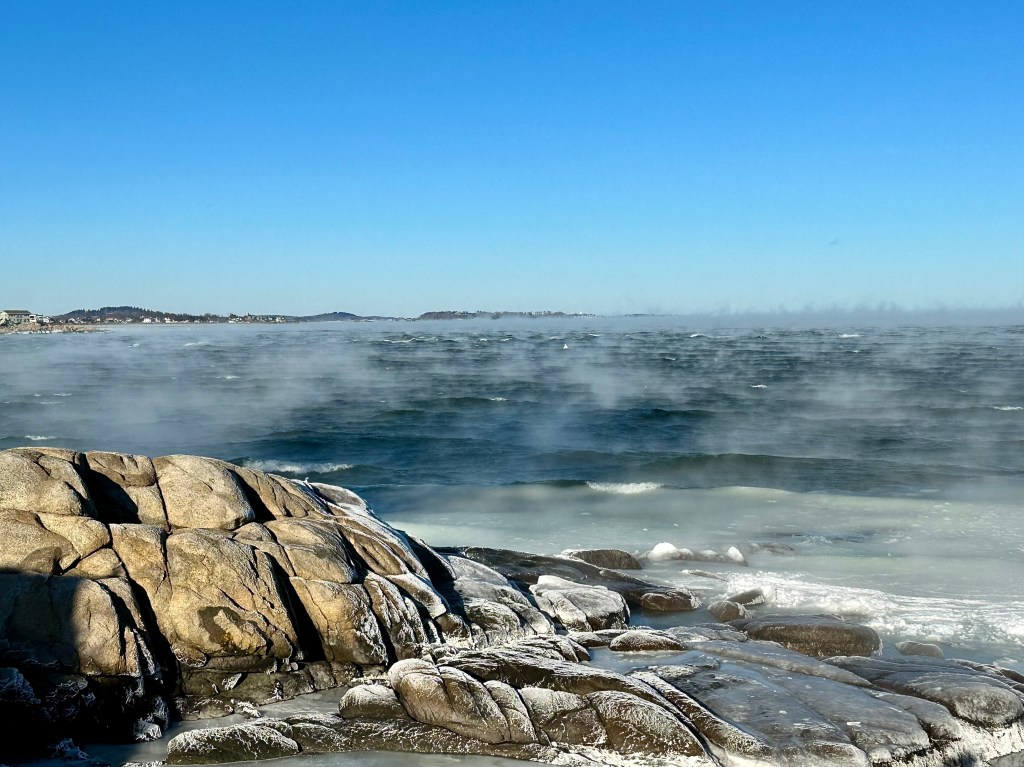 15 seconds of video sea smoke past Thacher Island Twin Lights 7:30AM Feb 4, 2023