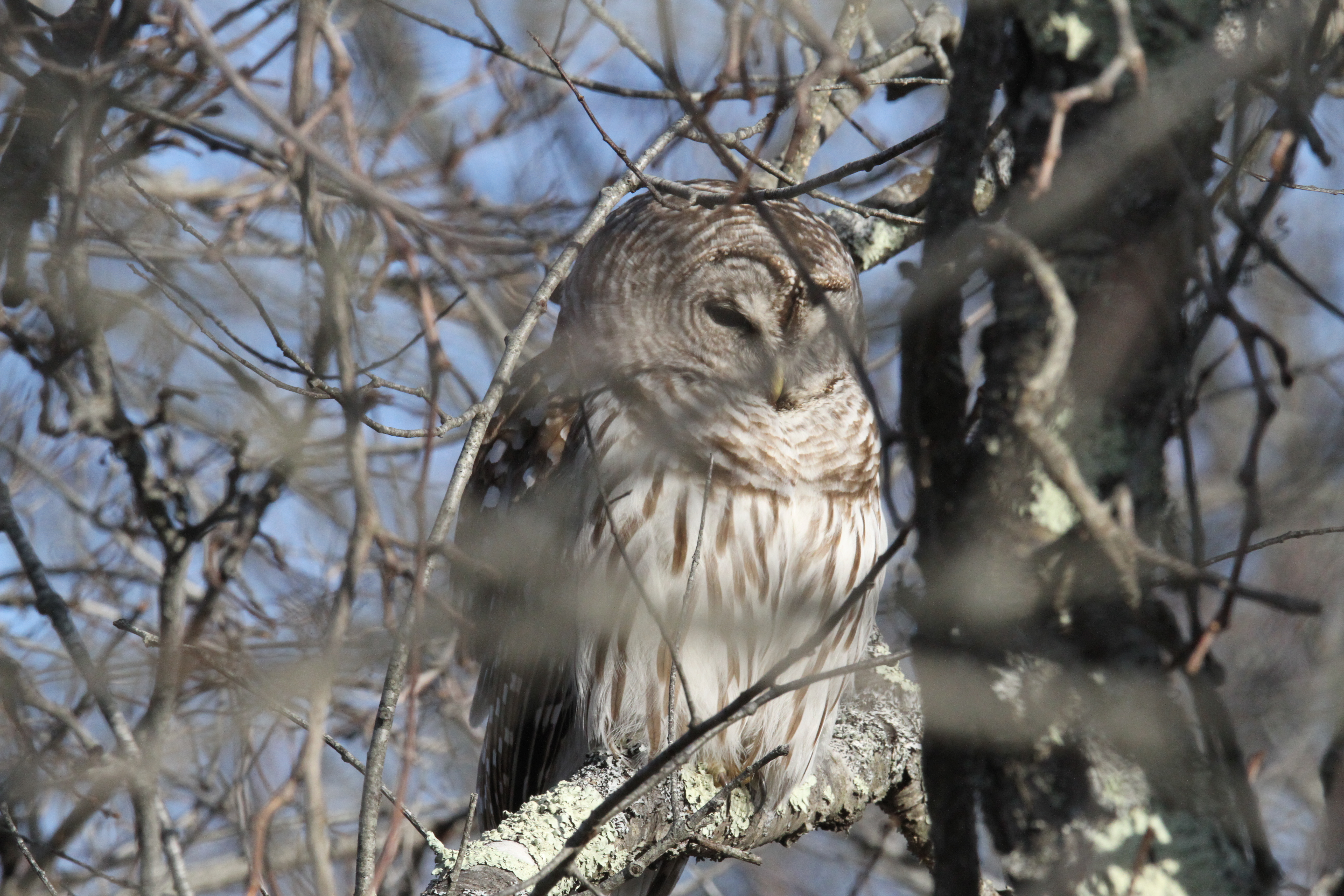 We have been fortunate enough to see a barred owl at a nature area a couple of times recently. And, since Scottie is always asking about my bird sightings, I’ll dedicate this one to him! Here you go Scottie. This one’s for you. “Barred from the Nest?” is Scottie’s question!! HAHA PS I am deliberately not disclosing its location at it has become a bit of an issue with interested onlookers disturbing the wildlife.