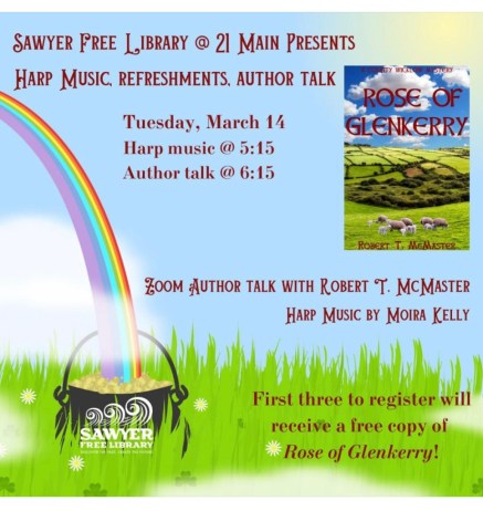 Then at 6:15 p.m., Massachusetts author Robert T. McMaster will introduce his latest novel, Rose of Glenkerry: A County Wicklow Mystery. He will present via Zoom, which will be broadcast at the Library for viewing. Both a mystery and a touching love story, the book is set amid the incomparable scenery of Ireland’s County Wicklow. Bob will read excerpts from his book, accompanied by images and music of the Emerald Isle.