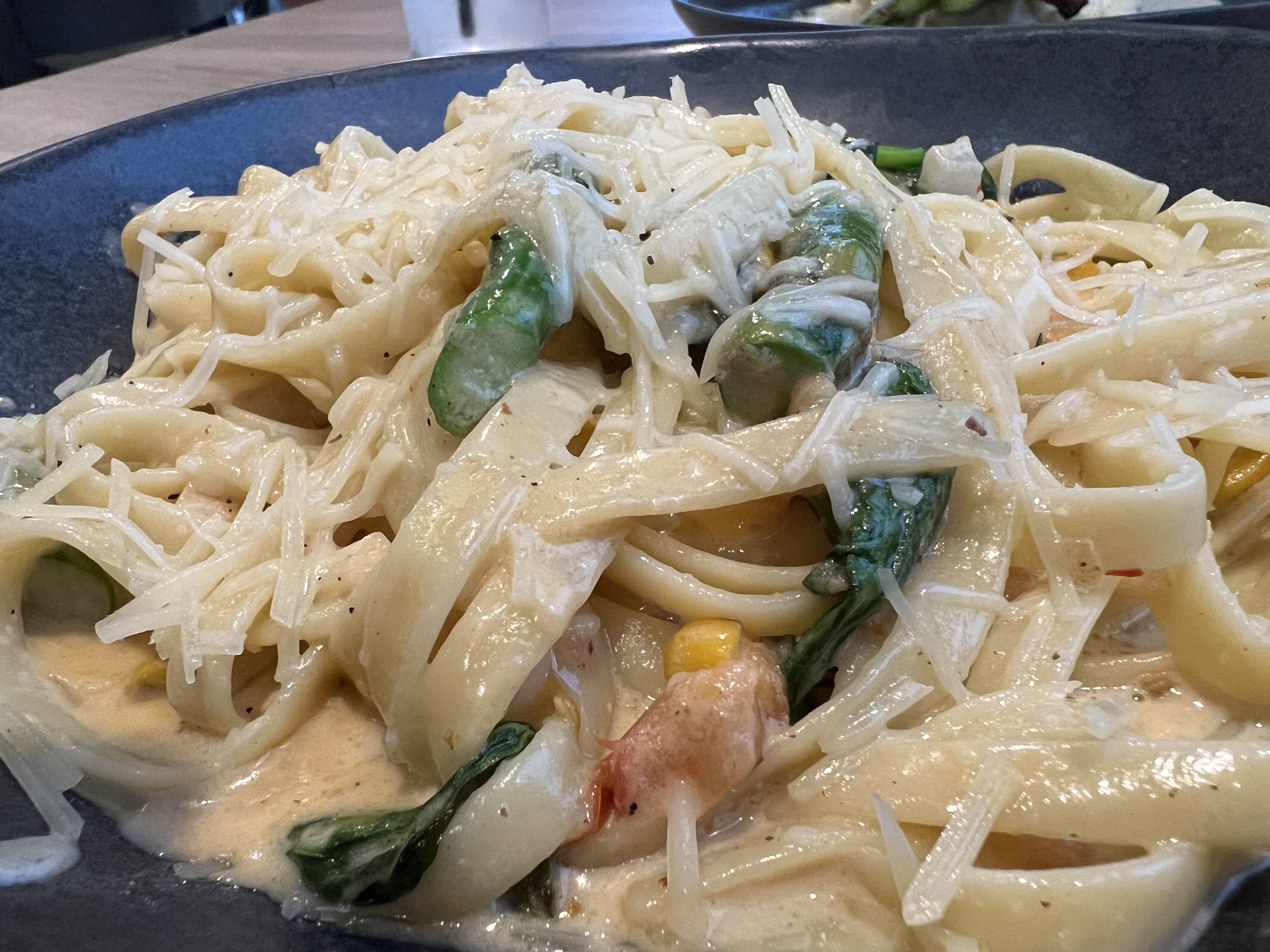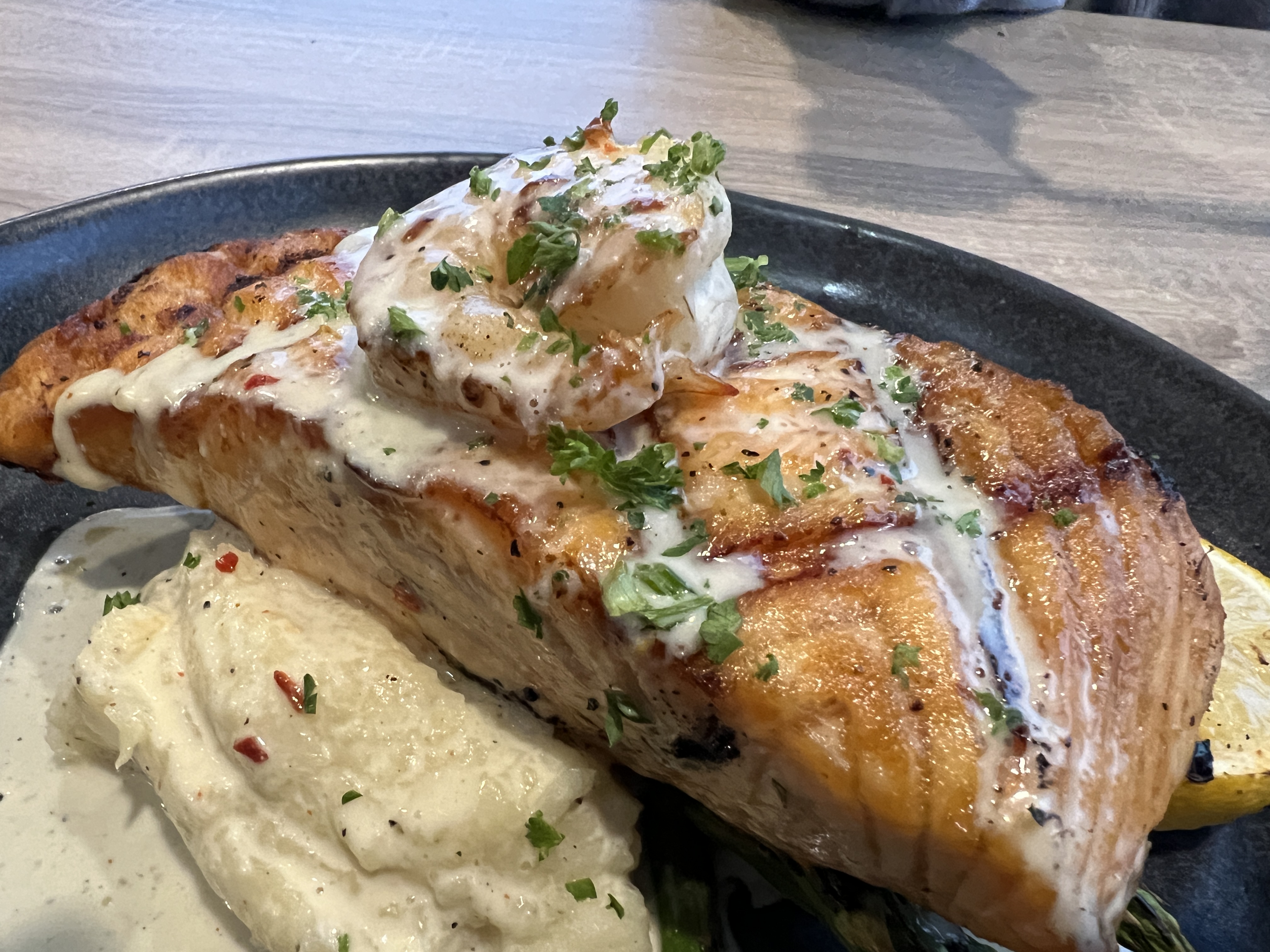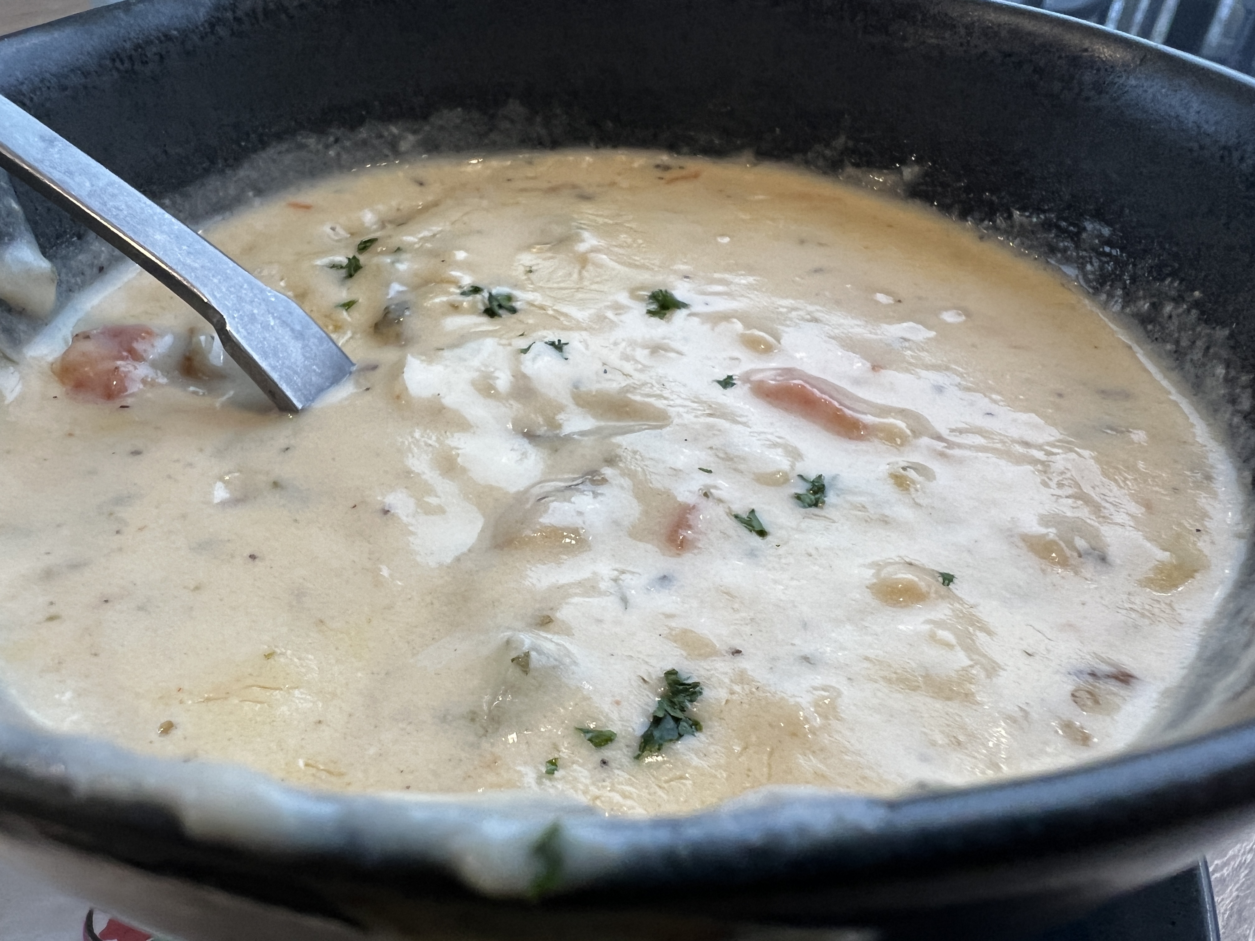 Seasoned and seared Cajun salmon with parmesan garlic mashed potato, asparagus, topped with seared shrimp and creole cream sauce. Hannah’s Vegetarian Pasta Pasta tossed in our creamy sauce with asparagus, diced tomatoes, spinach and corn Clam Chowder Creamy hearty, bacon, fresh vegetables, diced carrots, celery, parsley, clams, slow simmered to creamy consistency, served with garlic bread.