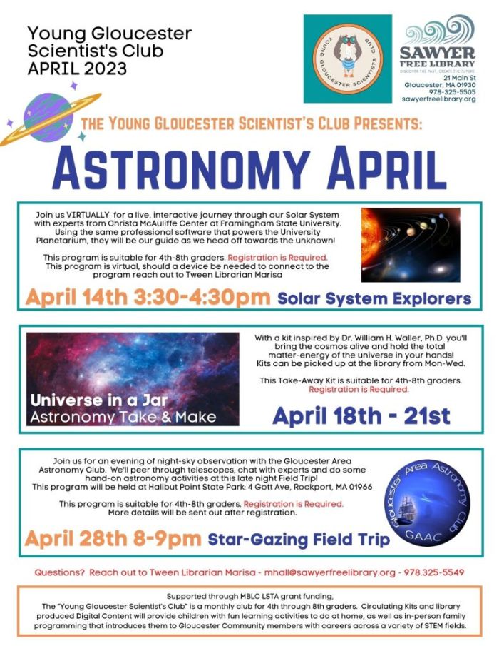 YGSC: Solar System Explorers – The Young Gloucester ScientistsClub is hosting a live virtual interactive journey through our Solar System withexperts from Christa McAuliffe Center at Framingham State University. This program is suitable for 4th-8th graders. Registration isrequired to receive the link. Thisprogram is virtual, should a device be needed reach out to Teen Librarian Marisa.