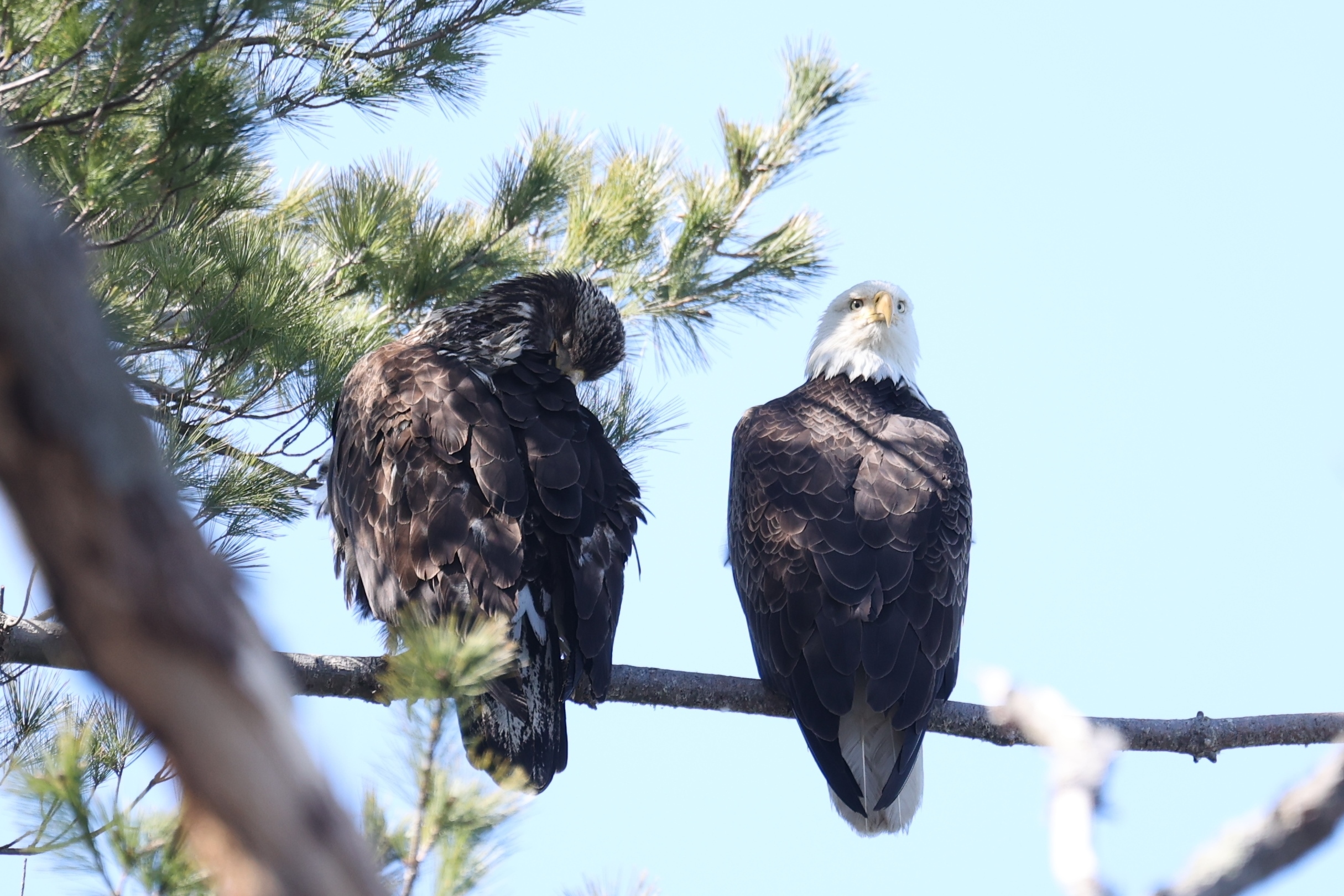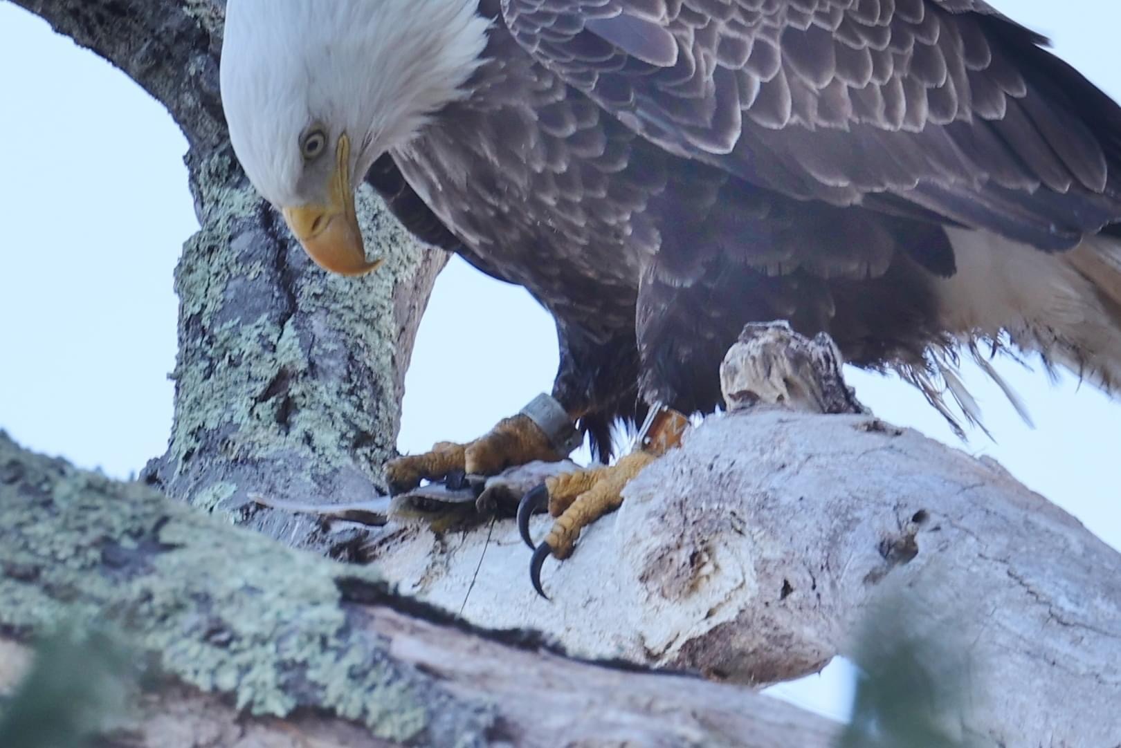 Many of you read a couple of weeks ago that we spotted a pair of eagles nearby and they appeared to be an adult and a younger eagle. The first photo here might look familiar as I published it at the time. This photo was used to confirm that this eagle is likely a bird born in Amesbury in 2015; identified as MM by Division of Fisheries and Wildlife (MassWildlife). Thanks to the input and efforts from Darlene (of Salem NH) and Laura (fellow eagle lover), I have put together my theory about this pair. It’s only a theory and we may never know for sure, but it’s my story and I’m sticking to it.
