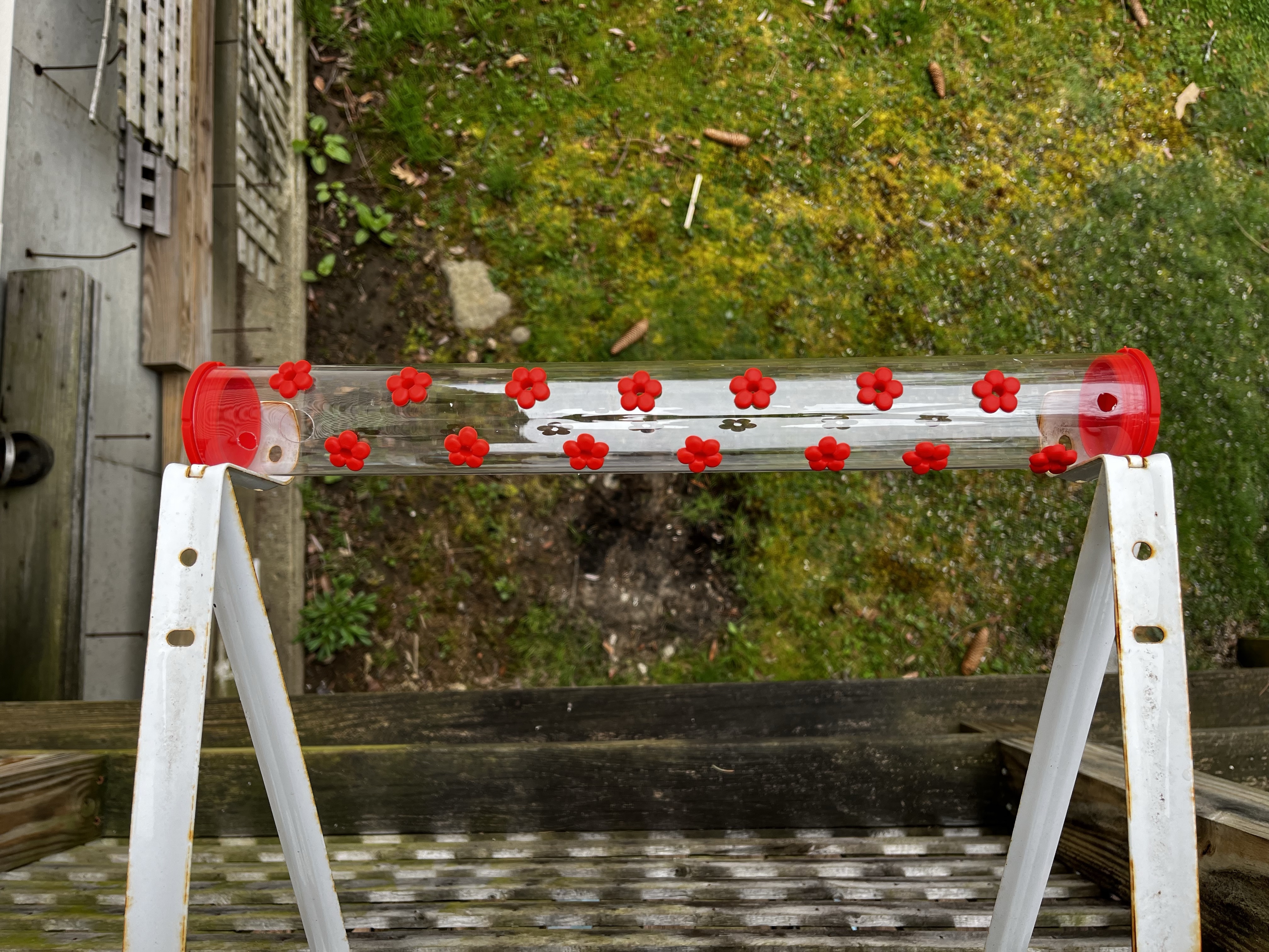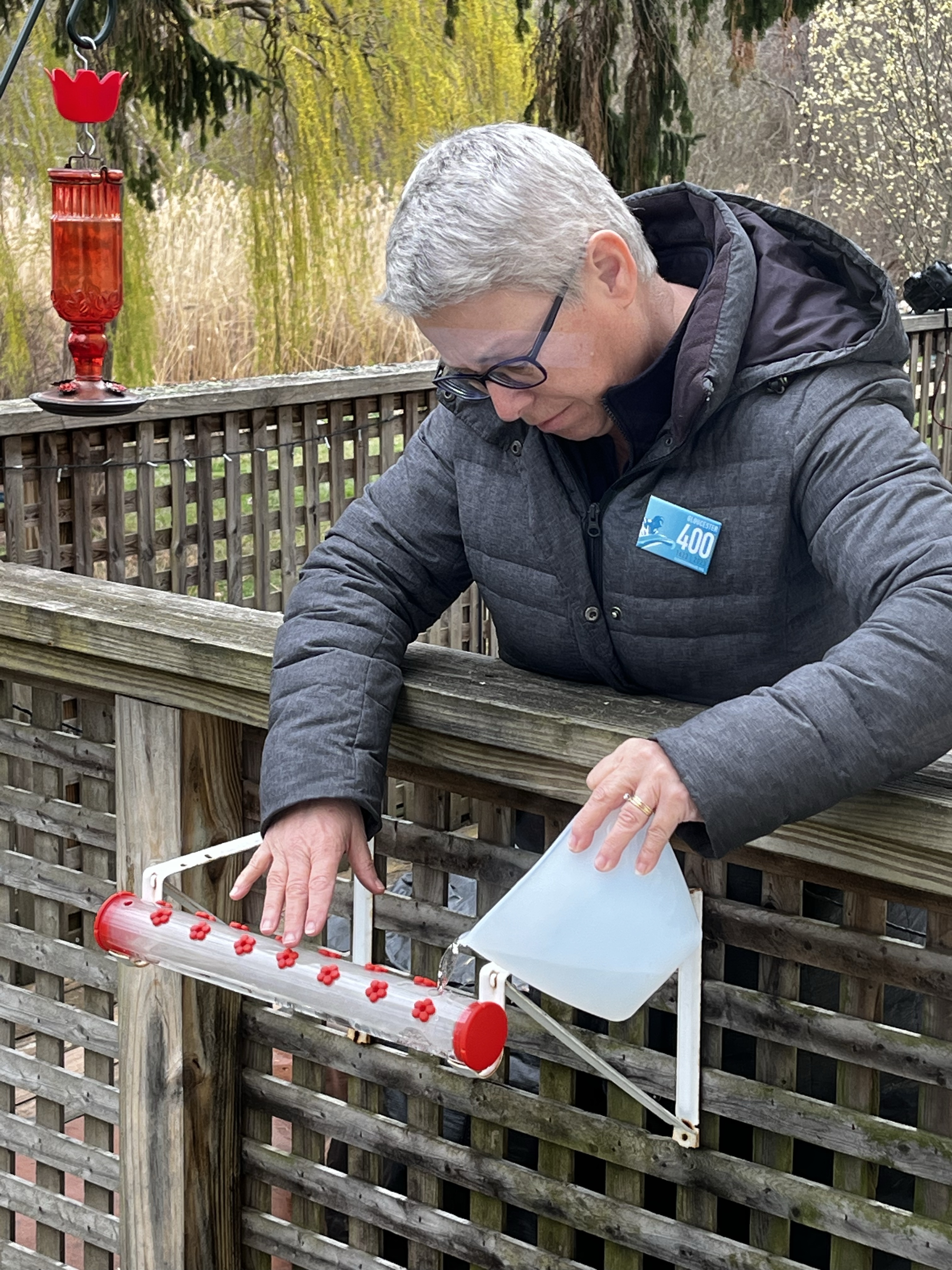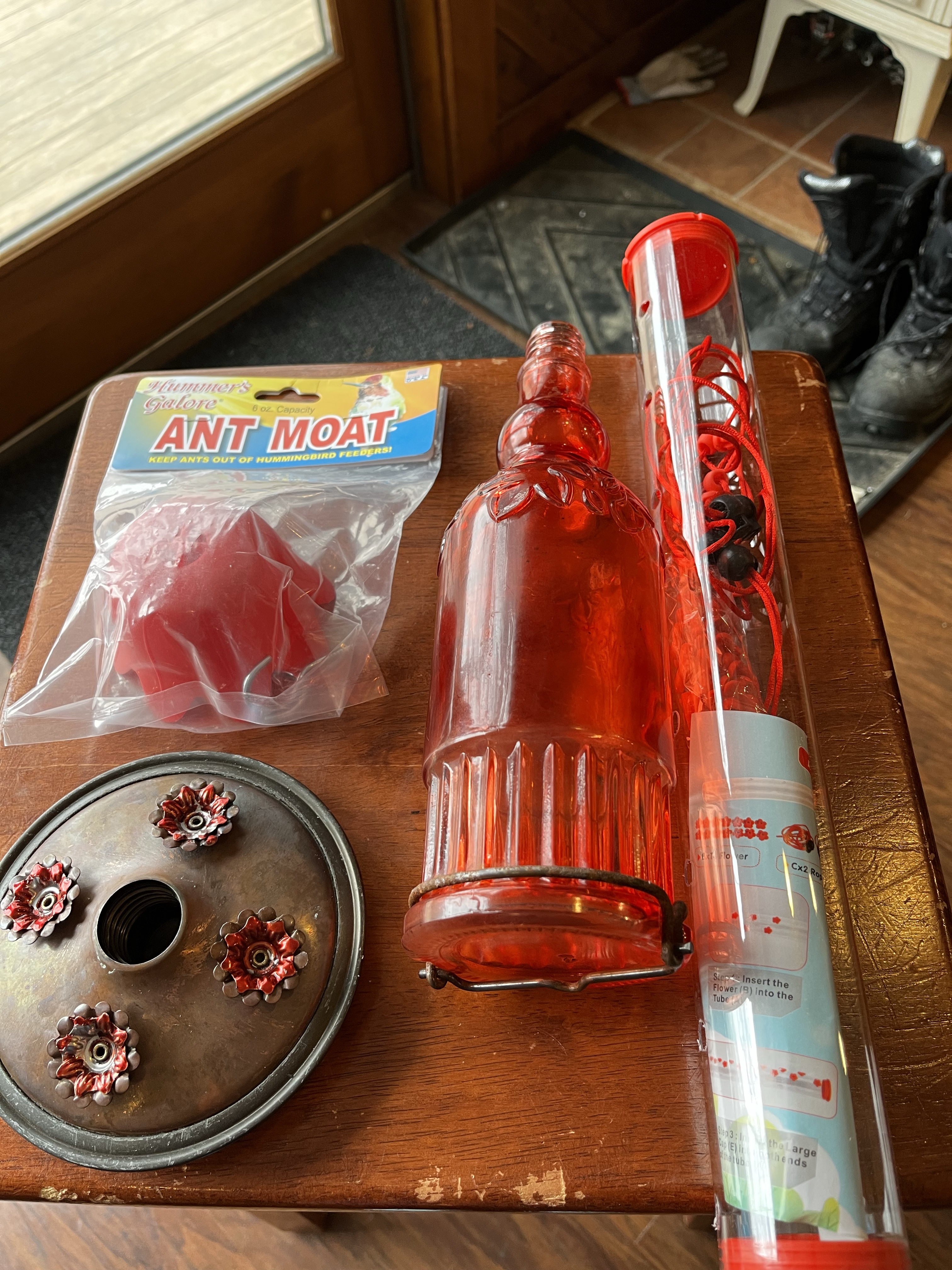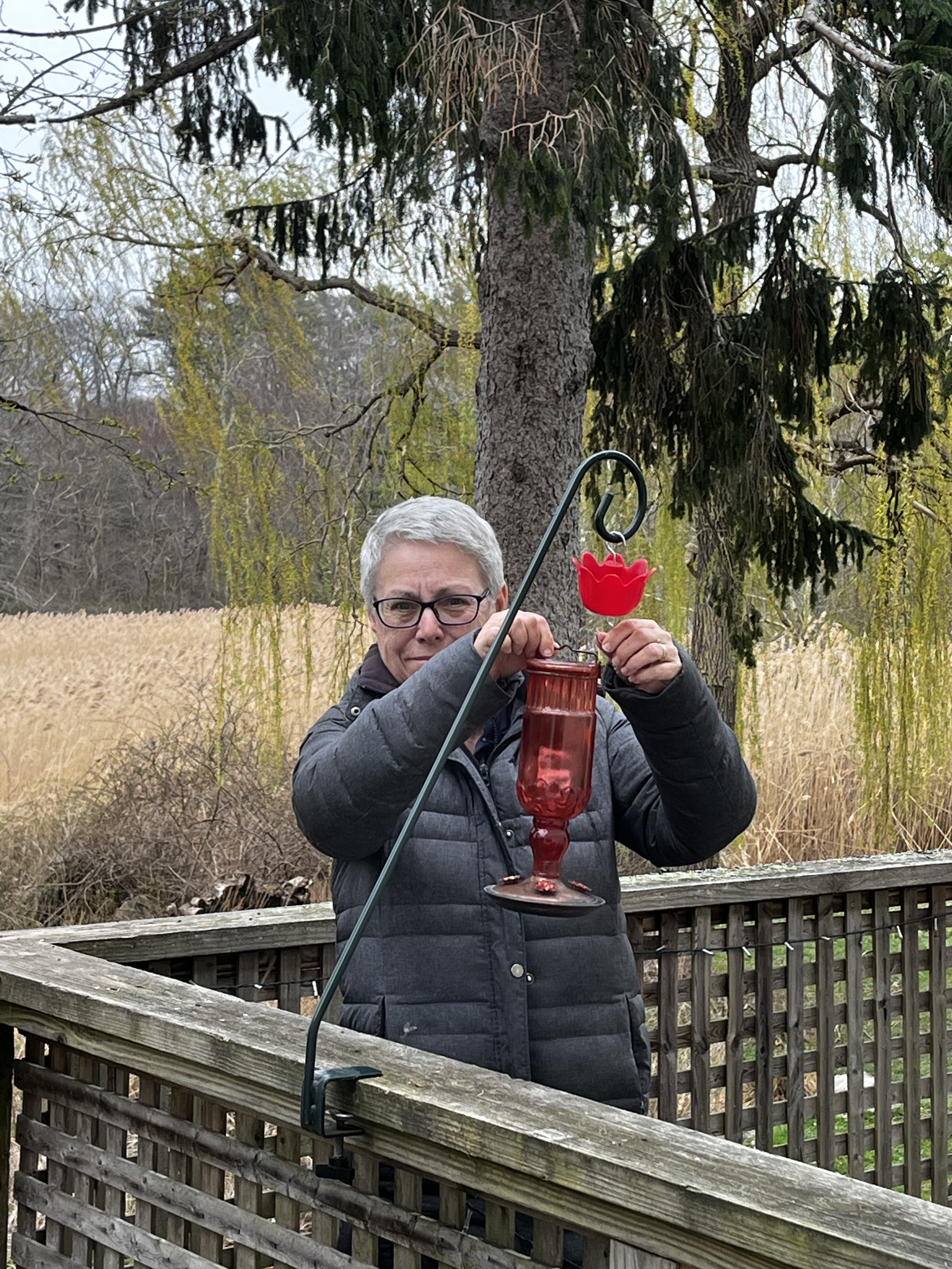 Our hummingbird equipment took a beating last year, so we refreshed with a new feeder this year. These photos show my hummingbird preparation over the weekend. I made nectar (4 parts water to 1 part sugar boiled then cooled) and filled our RED feeder as well as the new “drive by” tube. I noticed on the Hummingbird Migration 2023 Google map that a few hummingbirds have been spotted in our area already so perhaps I am a little behind schedule. If you are interested, I saw good information at this site Empress of Dirt.
