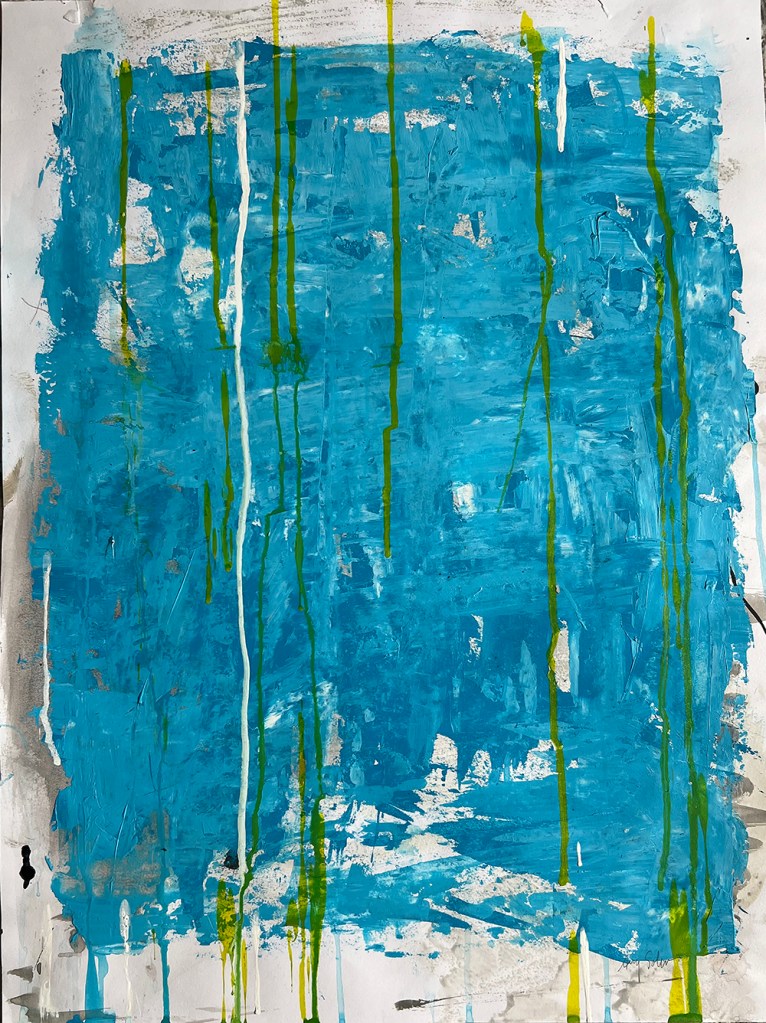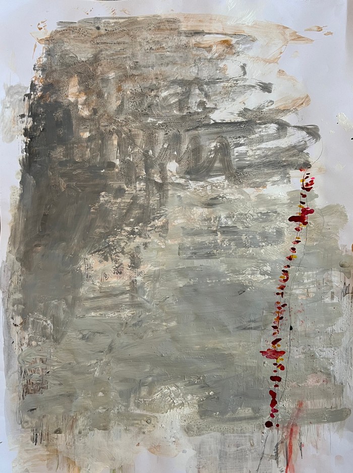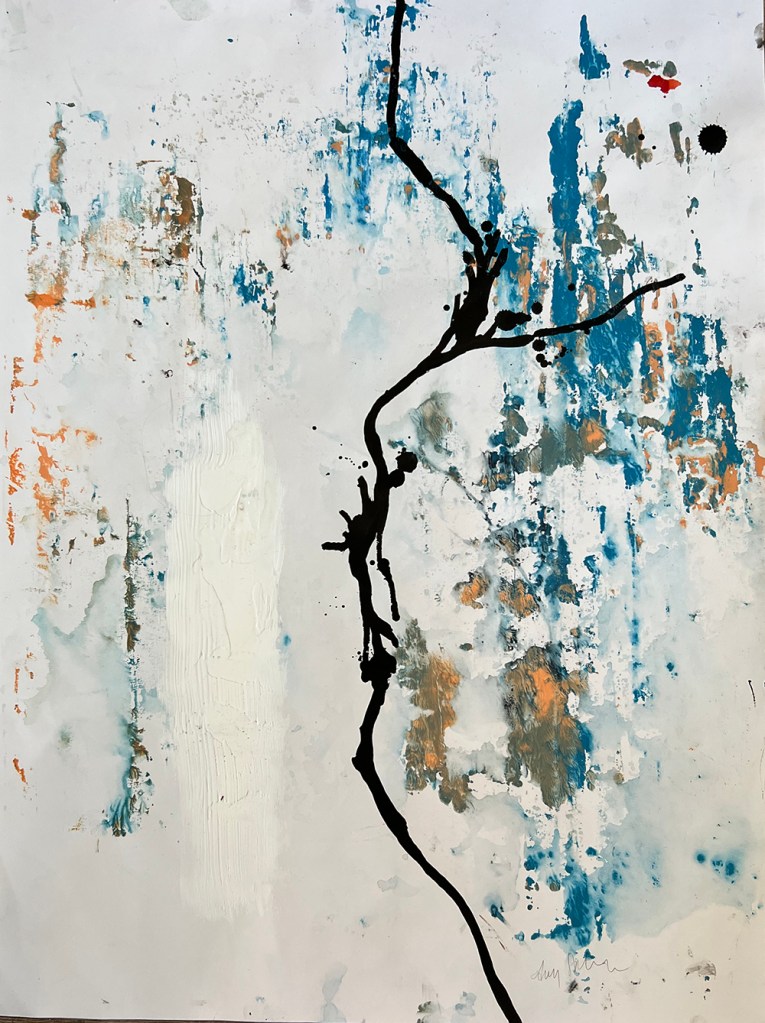 “These works are made with paints, medium and inks applied to the paper with marks, dots and drips. Over the past two years this has become my form of personal daily meditation practice: a way to connect with myself through the materials. What is in this gallery are remnants of the search and process. A shadow from a dance,” and her work in mixed media on wood as frozen disintegrations. “Again, what interests me is the power contained in the materials. Objects, colors and textures come together as a visual poem.”