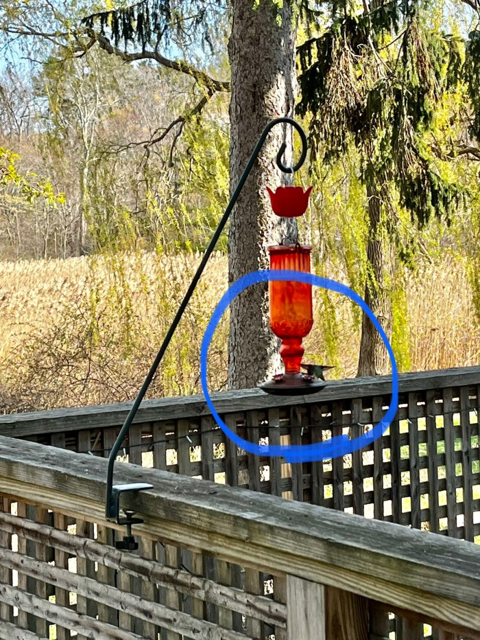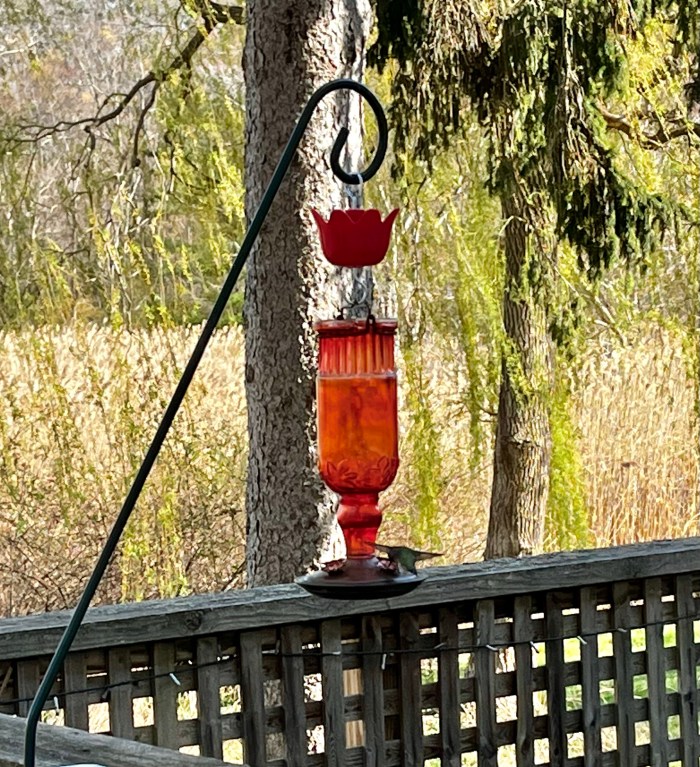 Since the challenge was thrown down regarding who might document the first hummingbird sighting, I’d like to submit the following (not great) cell photos from yesterday on our deck. But, no photos–no proof, so here you go. I should have known this would happen the minute I decided to leave the camera in the car because we were heading back out shortly…… it was nice to return to the dock with most of the gang for yesterday’s podcast AND the hummingbirds returned yesterday too. I don’t think it was a coincidence. I expect to improve on these photos as the season goes along.