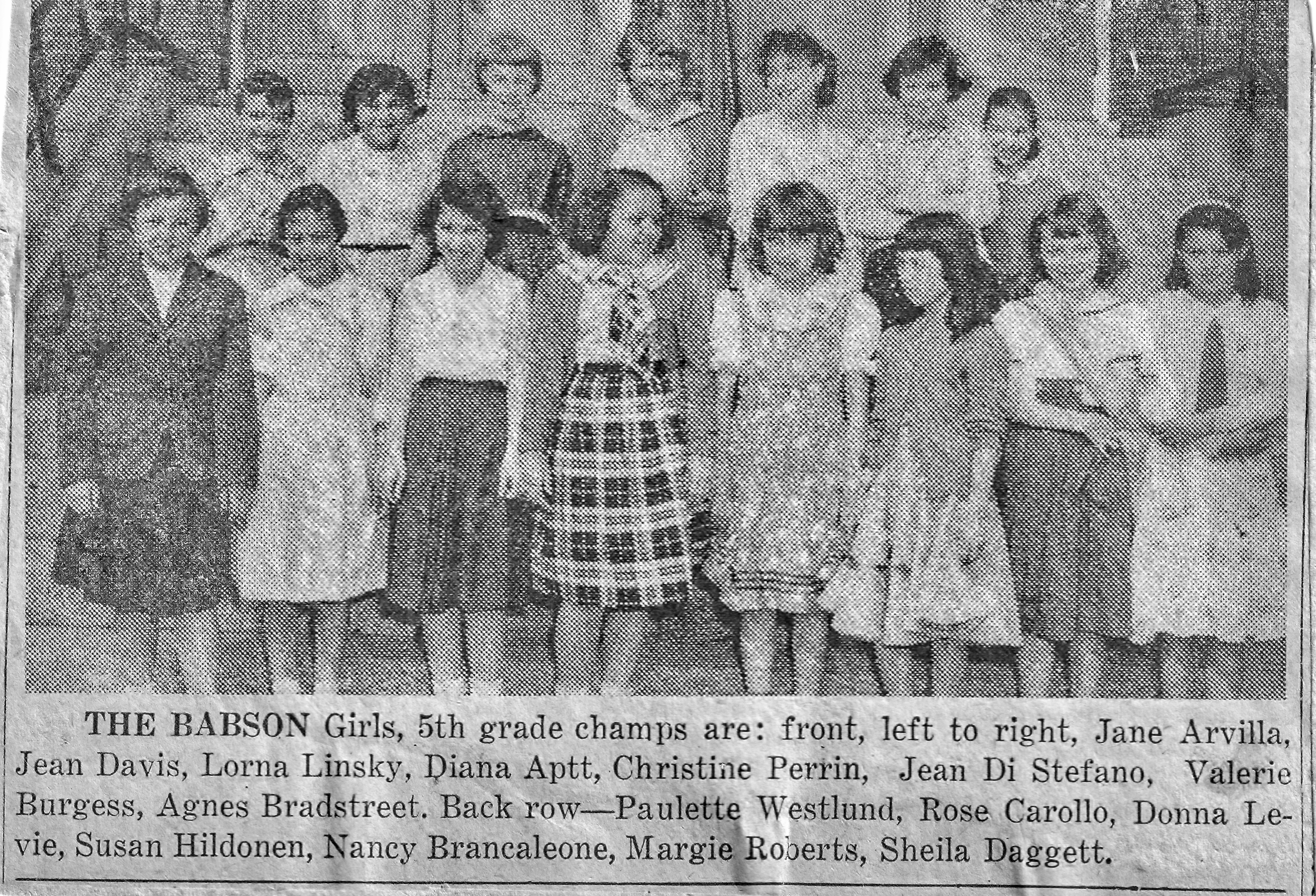 The Babson Girls, 5th Grade champs are: front to left Jane Arvilla, Jean Davis, Lorna Linsky, Diana Aptt, Christine Perrin, Jean Di Stefano, Valerie Burgess, Agnes Bradstreet. Back Row – Paulette Westlund, Rose Carrollo, Donna Levie, Susan Hildonen, Nancy Brancaleone, Margie Roberts, Sheilla Daggett.