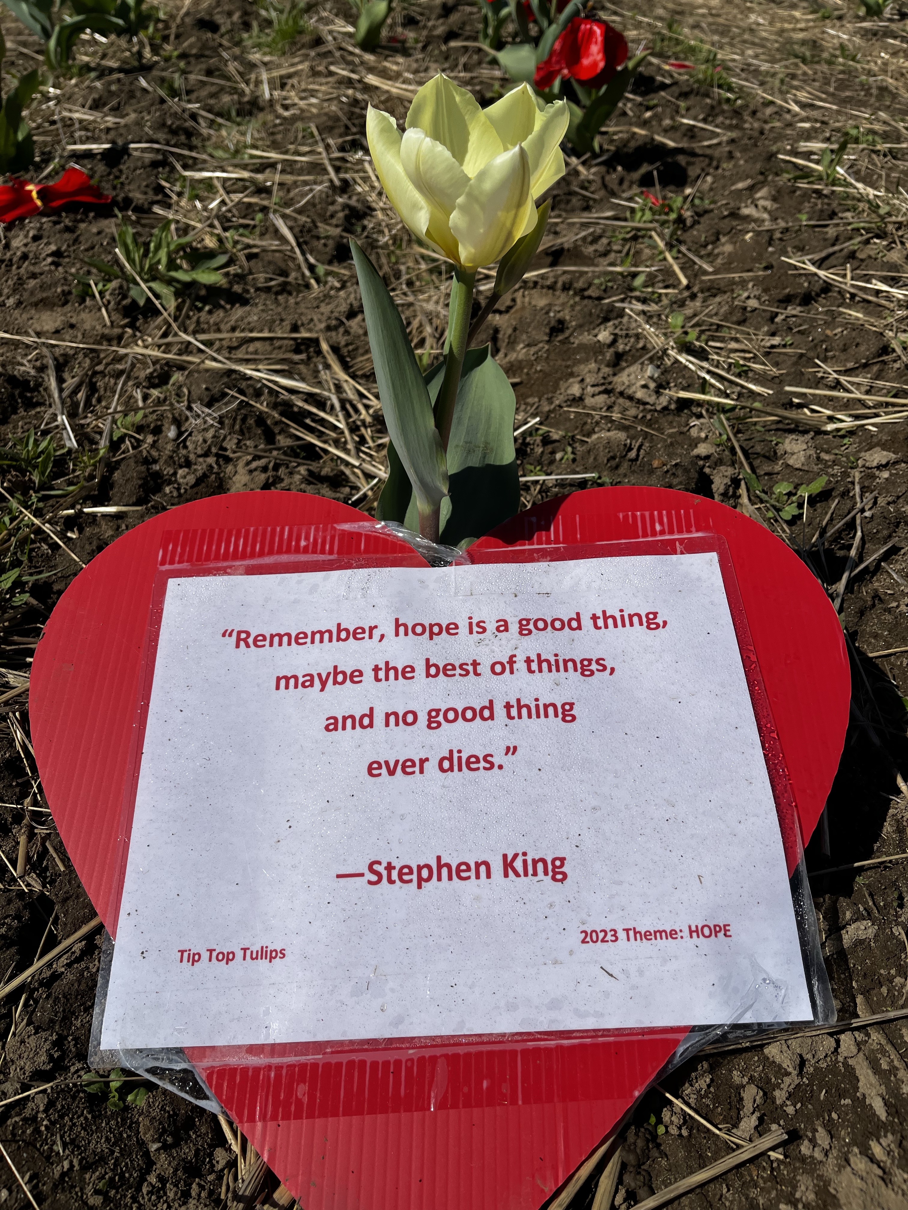 Happy May Day! This post is appropriate for today. I made my annual visit to Tip Top Tulips in Ipswich (Lowes Lane right off 133 behind Dairy Queen) recently. Though I LOVE the Generous Gardeners Tulips along the boulevard, I also love to go to Tip Top Tulips. Part of the reason is that you can pick and purchase tulips there; the other part is the extra fun the baby goats, alpacas and young children offer. I was greeted by Farmer Paul, (who remembered me!) who introduced this year’s theme of Hope. The annual themes are another reason I love stopping by. You do need tickets (reasonably priced) which can be purchased online or at the gate. Tulips bloom only for a short period, so if you have time in your schedule maybe you want to stop over there and feast your eyes. Maybe you want to try the goat yoga! If you do, you can let me know what you think since you won’t see me doing that…..