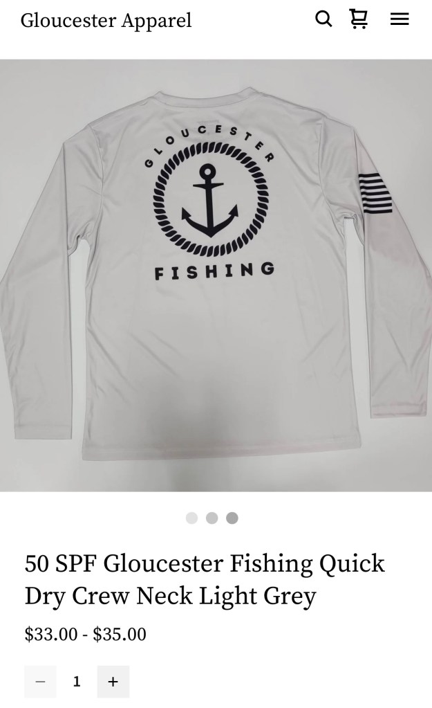 UPF 50 Long Sleeve Crew Neck Sun Shirt New Gloucester Fishing Crew Necks With the American Flag On The Sleeve (because we’re proud Americans) Gloucester Map With The Annisquam and Gloucester Fishing On The Back with a Stout Anchor!