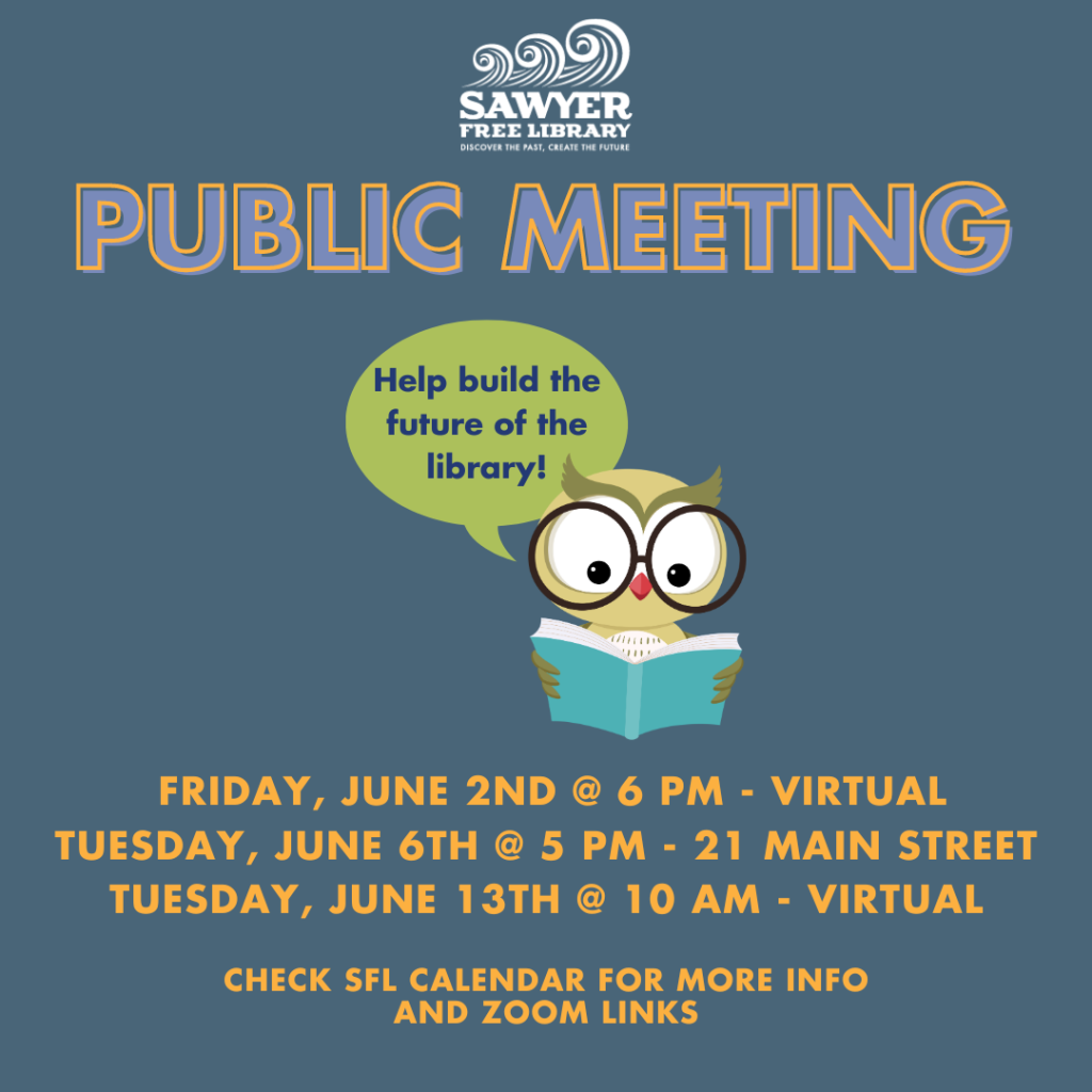 Community Conversation In Person on Monday, June 5 from 2 to 3:30 p.m. at the Sawyer Free Library’s temporary space at 21 Main Street.
