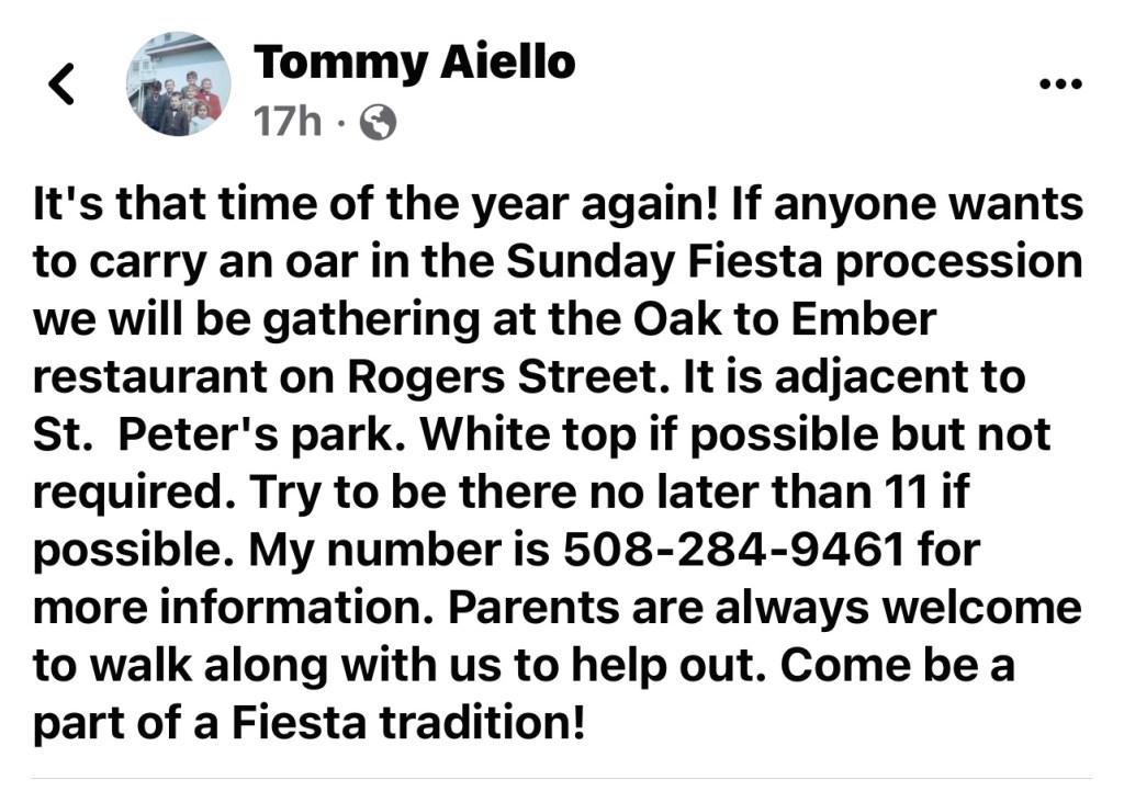 If anyone wants to carry an oar in the Sunday Fiesta procession we will be gathering at the Oak to Ember restaurant on Rogers Street. It is adjacent to St. Peter’s park. White top if possible but not required. Try to be there no later than 11 if possible. My number is 508-284-9461 for more information. Parents are always welcome to walk along with us to help out. Come be a part of a Fiesta tradition!