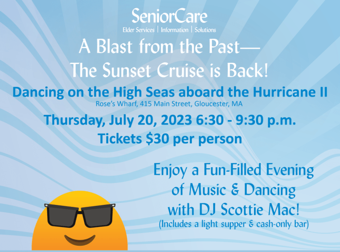 SeniorCare is pleased to announce the return of its Sunset Cruise Fundraiser, an evening cruise aboard Cape Ann Whale Watch’s Hurricane II, on Thursday, July 20, 2023. The evening includes a light dinner, dancing and entertainment with DJ Scottie Mac, and raffles. All are welcome– tickets are $30 each and can be purchased by contacting SeniorCare at 978-281-1750 or online at www.seniorcareinc.org. Sponsor opportunities are available.