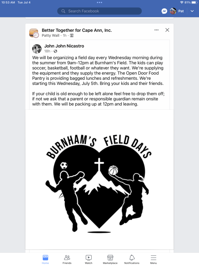Burnham’s Field Days start tomorrow and will continue on Wednesday mornings all summer. Free lunches for the children provided by Open Door Food Pantry. Seems like a win-win for parents and caregivers.