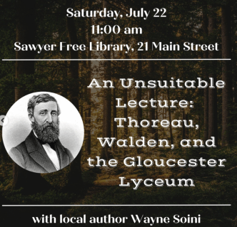 Saturday, July 22, 11:00 a.m. to 12:30 p.m., Wayne Soini to present“An Unsuitable Lecture: Thoreau, Walden, and the Gloucester Lyceum”– An unnamed critic for the Gloucester Telegraph declared that Henry D. Thoreau’s lecture was “unique” before he took umbrage and condemned it as “not exactly suitable for a Gloucester audience.” 175 years ago, in December 1848, Thoreau auditioned his upcoming book, Walden, before an audience of Gloucester folks at the Gloucester Lyceum (today, the Legion Hall).
