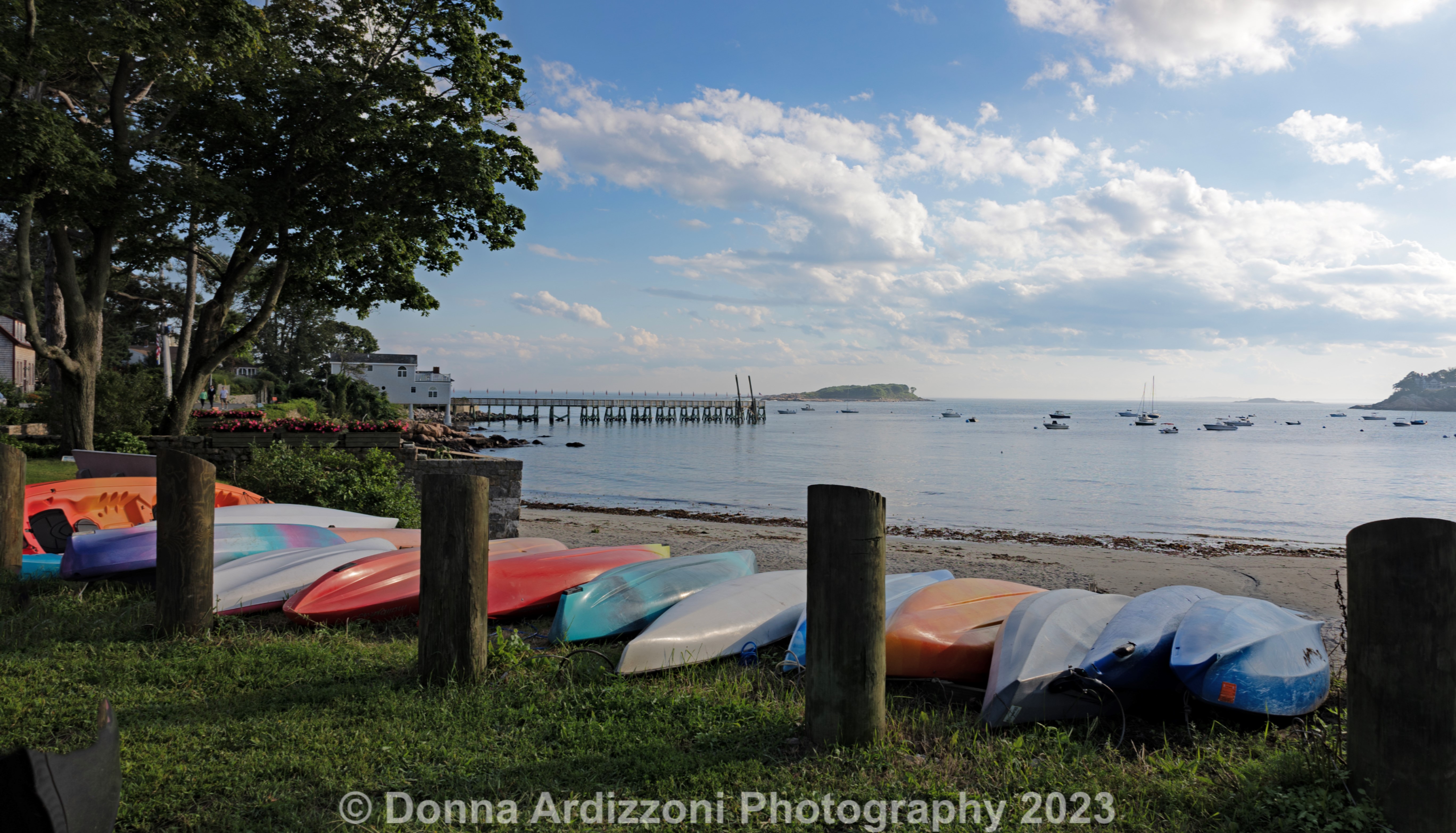 Kayaks at the end of the day with the Magnolia Pier in the background.