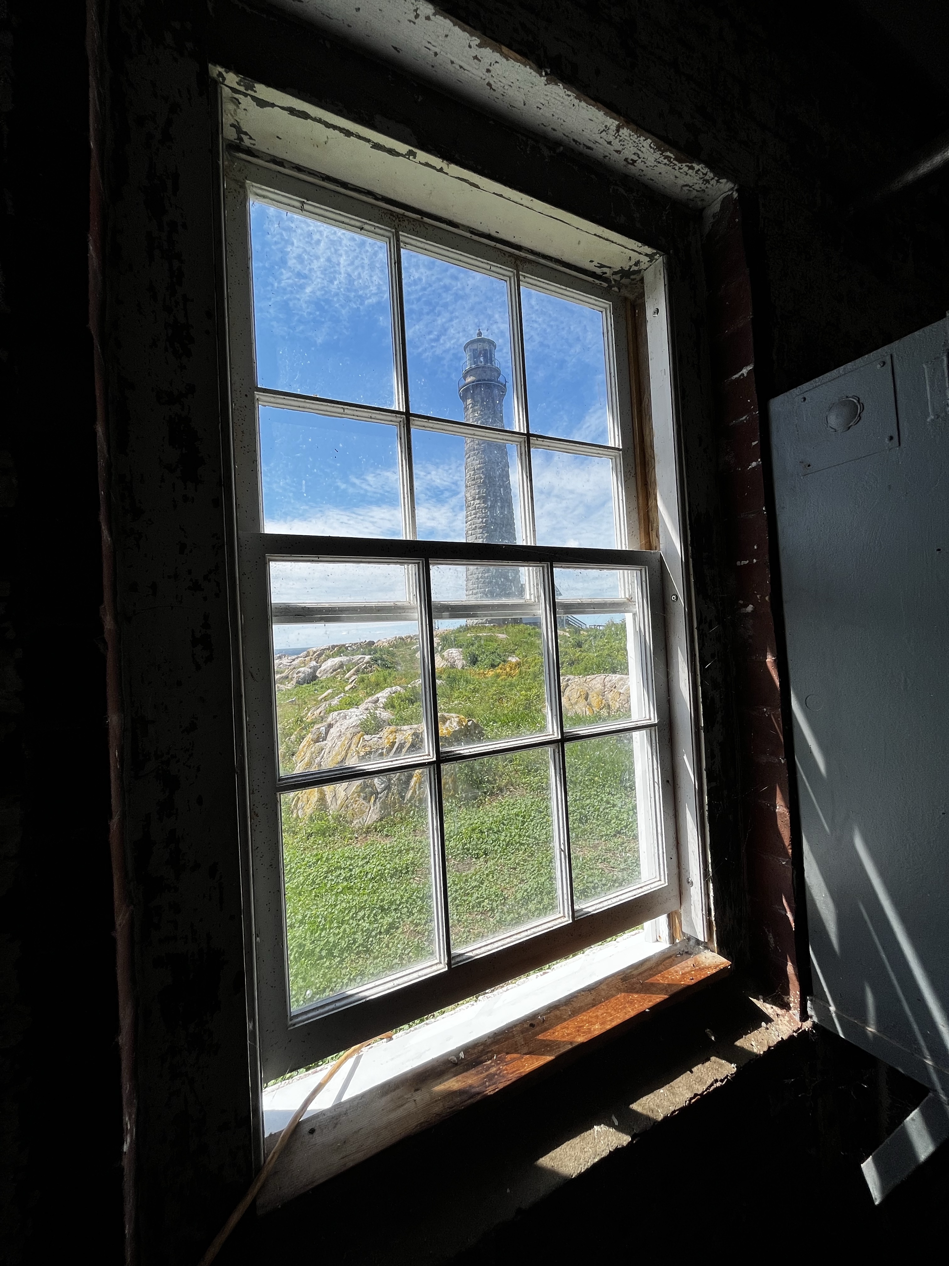 Cape Ann Light Station Thacher Island is a National Historic Landmark and I highly recommend a visit. Tickets for launch reservations are available on their website (click here for info) and it’s a very pleasant way to spend a few hours on a nice day. Jim had never been out there and it had been a while for me, so off we went a few days ago. It’s run entirely by volunteers who couldn’t have been more pleasant, even after we delayed departure due to our lack of attention to details like the launch location (now Rockport Granite Pier). I recommend wearing boots or sturdy footwear as the paths are a little uneven, but mostly due to bird poop. Jim climbed the 156 steps to the top of North Tower and wanted a photo as proof, so here you go.