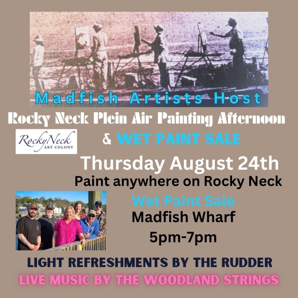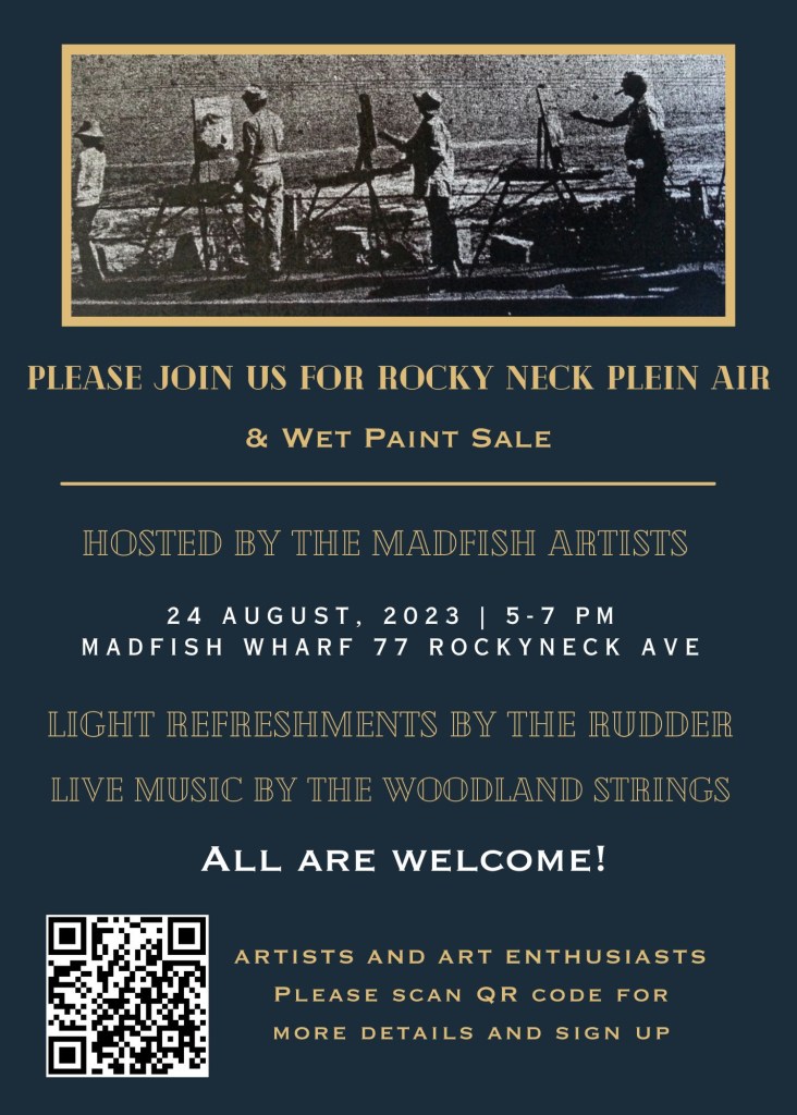 Please join us for an afternoon on historic Rocky Neck, Gloucester, MA for an afternoon of plein air painting. Known as one of the longest, continuously running art colonies Rocky Neck is home to a new generation of plein air painters, many whom live and work on Madfish Wharf. The event is open to all interested painters. Paint anywhere in the neighborhood morning and or afternoon and then join us between 5pm-7pm for a “Wet Paint Sale.” Artists will have an opportunity to display and sell their finished works on Madfish Wharf, during Gloucester’s Thursday evening Culture Splash. Live music by the Woodland Strings and light refreshments by the Rudder.