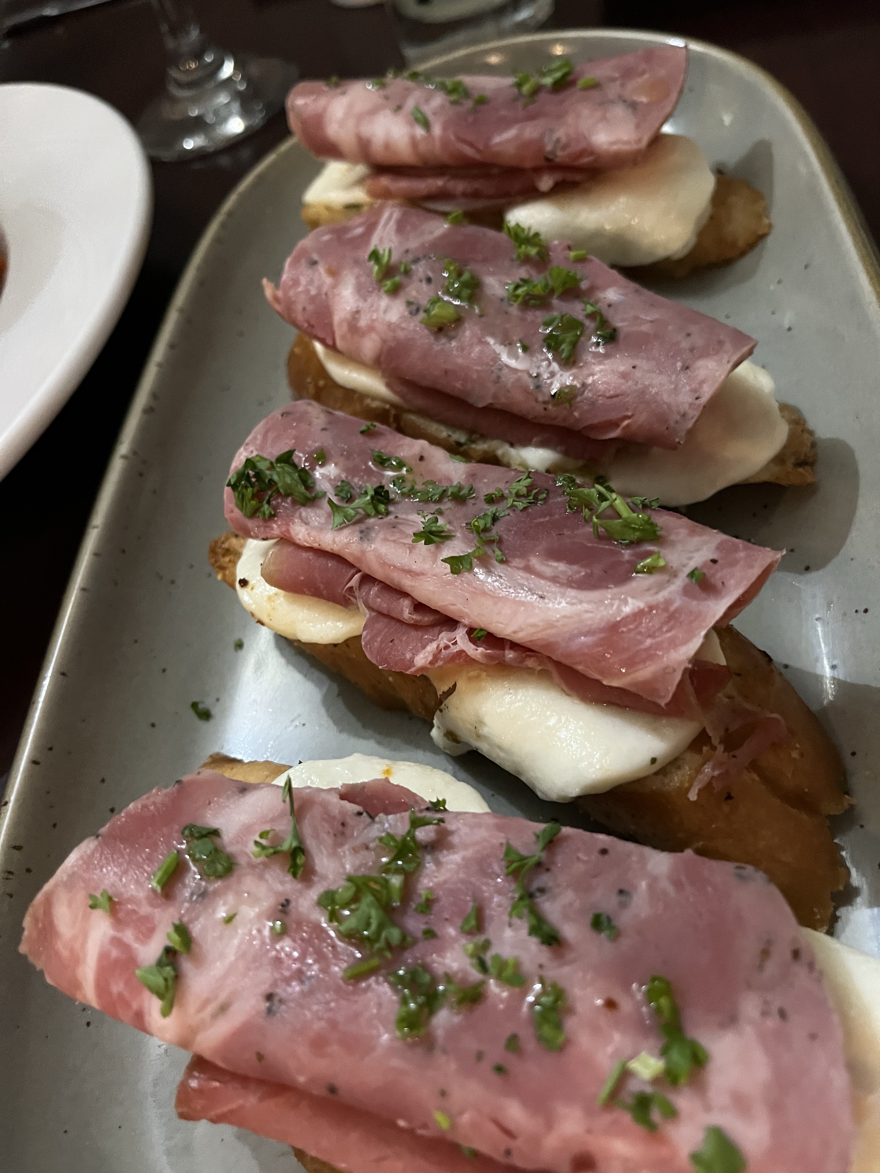 Jim had a side salad and the Bolognese. I had ravioli with a sausage side dish. We also ordered the crostini app (which as you can see, was very generous in portions). We each enjoyed our entrees and brought enough home for another meal. We each had a drink and the bill was very reasonable. We thought the menu was nicely varied and we are intrigued to try Vita Bella for lunch someday soon. Give them a try! They are ready for you!