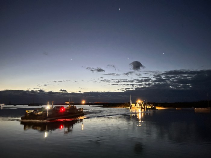 The Chappy Ferry. (Click the link for a video) Finn and I went to Martha’s Vineyard over the weekend because fishing the Martha’s Vineyard Striped Bass and Bluefish Derby (in it’s 48th year) has become a fall tradition (for about the last four years). With 4:45 a.m wake ups to be ready for the sunrise blitz, I got to watch the Chappy Ferry wake up with the world as well….and then watched it/them go back and forth for hours. It has always made me laugh. On Time II and On Time III go back and forth from the Edgartown Memorial Wharf to Chappaquiddick all day long. The trip from one dock to the other is just over one minute. It takes just over four minutes for a ferry to load up with cars (maybe 4 max), travel across the way, dock, unload, and reload, and make the return trip. Not sure why that cracks me up, but it does. It adds such an interesting twist to one’s commute I should think.