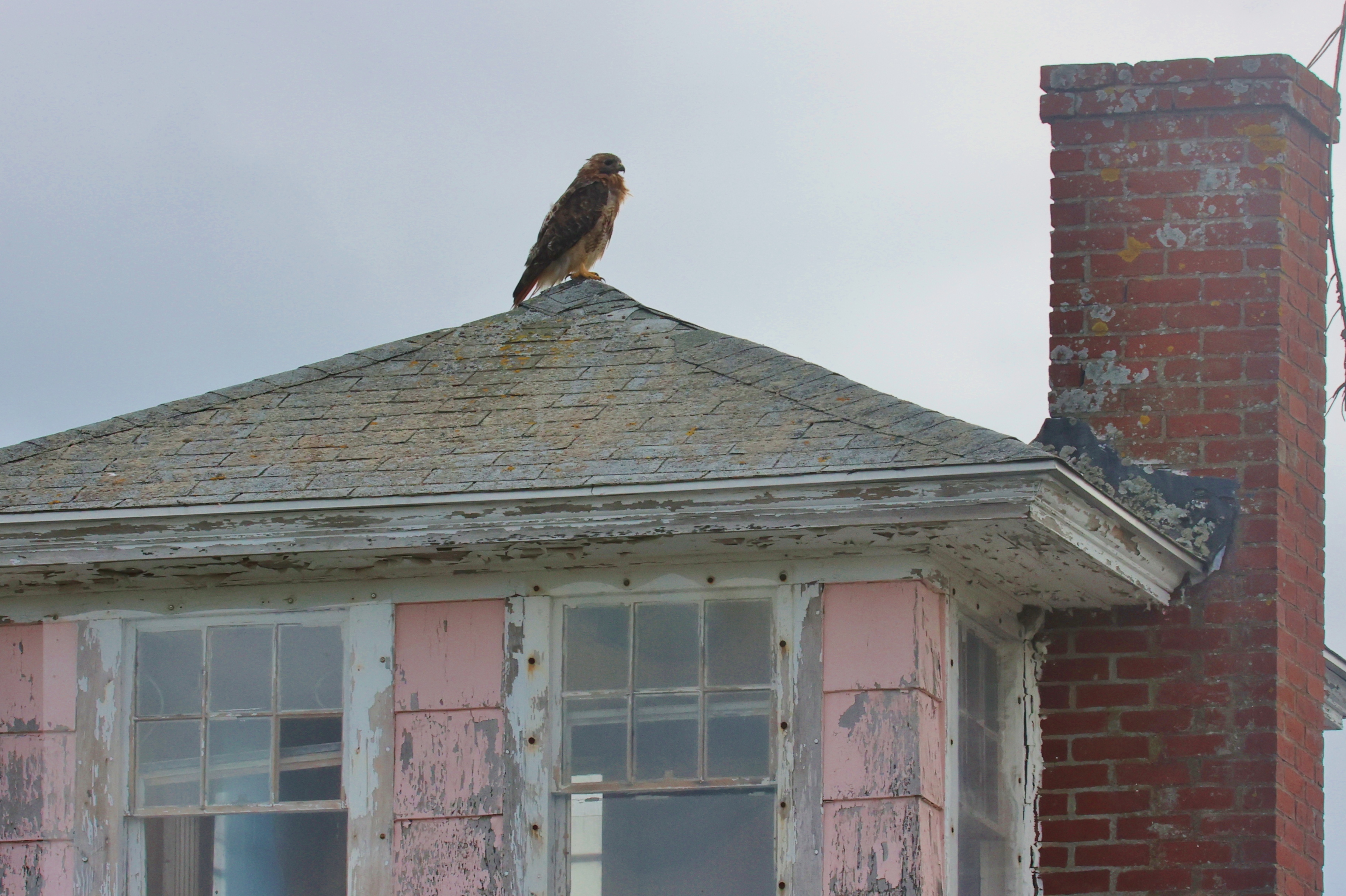 This hawk posed by nicely for us recently at the peak of the pink house on Plum Island in Newbury. A couple people stopped to ask me if this was an owl. Nope. Red Tail. Pink House. Grey Day.