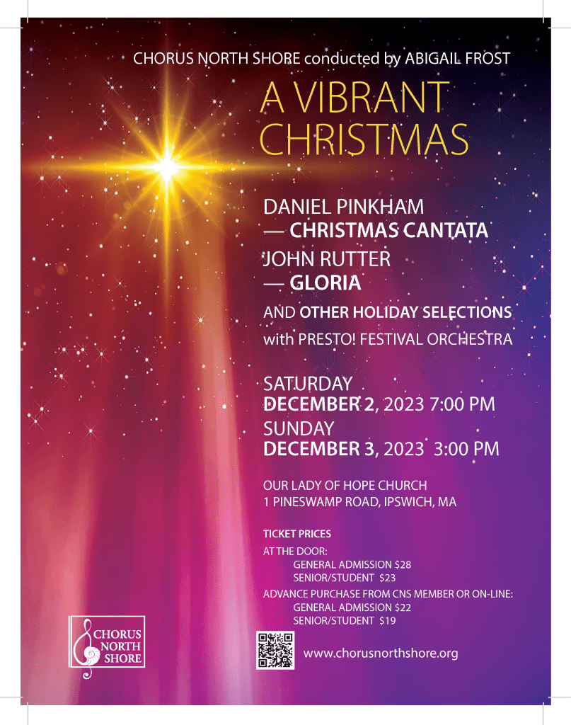 The performance will include Daniel Pinkham’s Christmas Cantata, John Rutter’s Gloria and other holiday selections. Joining the Chorus: the Bel Canto Choir from Ipswich High School, Presto Festival Orchestra and Accompanist, Jeffrey Patch.