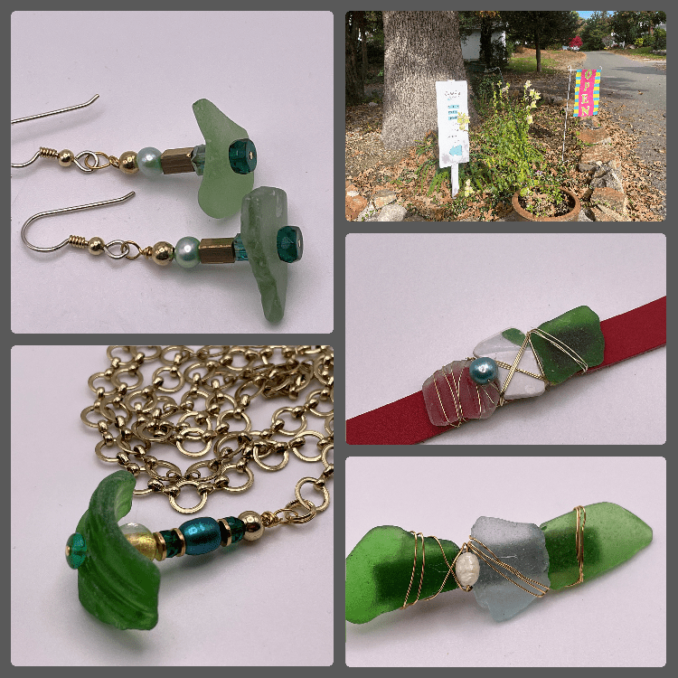 Each Friday, there will be a 20% promotion of some part of the collection. The items available for sale range from the smallest hair accessories to statement pieces designed with the rarest forms of sea glass – bottlenecks and perfume stoppers. The latest addition to the collection are Sea Glass Stepping stones for the garden. A few are available for sale, but most will be done by ordering for the Spring. Gift Certificates are available and custom work can be done if you have a favorite piece of sea glass you would like incorporated into the work. The designs have evolved based on unique finds over the years. Stop in for a cup of hot chocolate and join her in celebrating 20 years of making on Cape Ann.