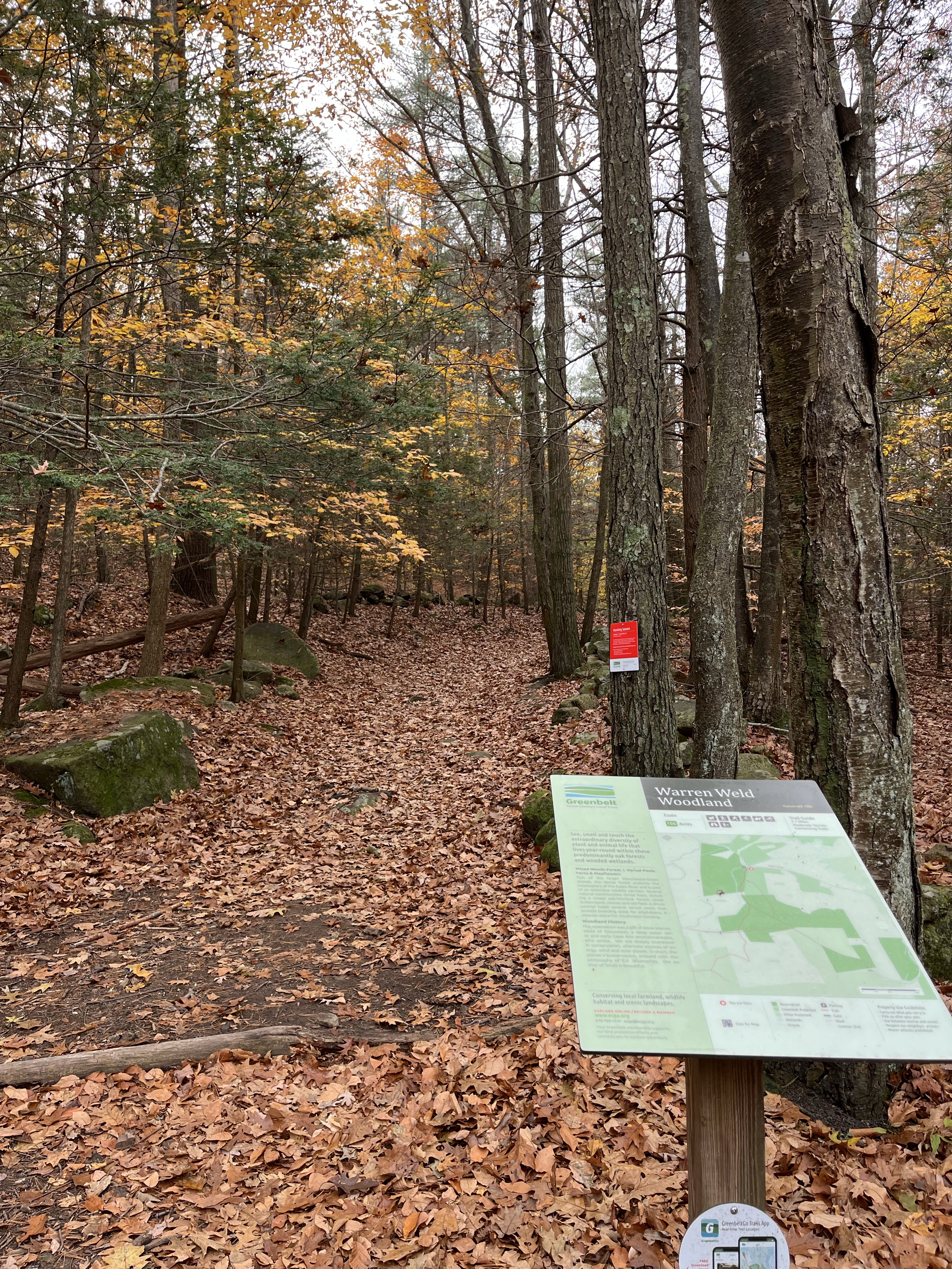 I’ve been hearing quite a bit about the fate of Apple St in Essex so I decided to take a ride to see this scenic roadway. I discovered a new (to me) trail and decided to explore a bit. The Warren Weld Woodland (say it 3 times fast) sits along Apple St and has a small parking area. The trail is leaf covered and surrounded by forest; though I did not go too far along the trail when I remembered I was alone and no one knew where I was! If you’re in a contemplative mood and need some time in the good old woods, I suggest taking the short ride and explore for yourself. I do not know what the residents will decided about Apple St but I expect to return to Warren Weld Woodland sometime soon!