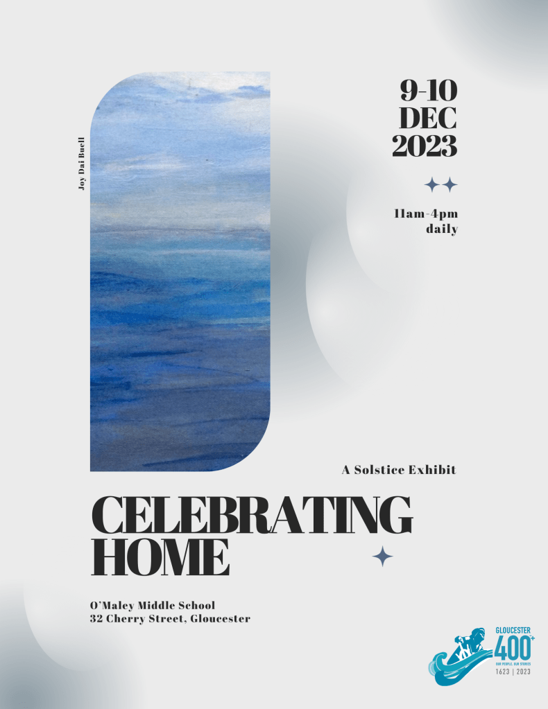 Together with Gloucester 400+, Joy Buell and her fellow artists from in and around Cape Ann, present Celebrating Home: A Solstice Eventthat is free and open to the public. OāMaley Middle School is the site for this festival of fine arts and crafts featuring works by Tom Amend, Elizabeth Bish, Denise Brown, Joy Buell, Sara Collins, Jane Gardner, Joanne Hurd, Ann Lafferty, Juliet Lockwood, Toby Milgrome, Kathy Morris, Dawn Pratson, Evy Stewart, Sue Van, and Leslie Wind amongst others.