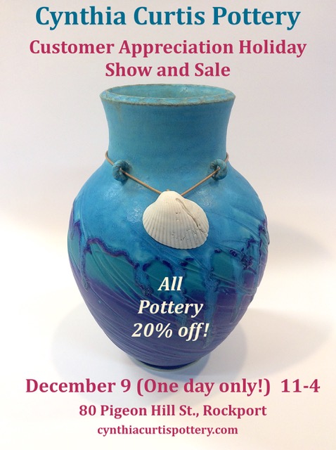 Customer Appreciation Holiday Sale the week of Dec. 4? All pottery 20% off. Refreshments served by the wood stove. Thanks and happy holidays!