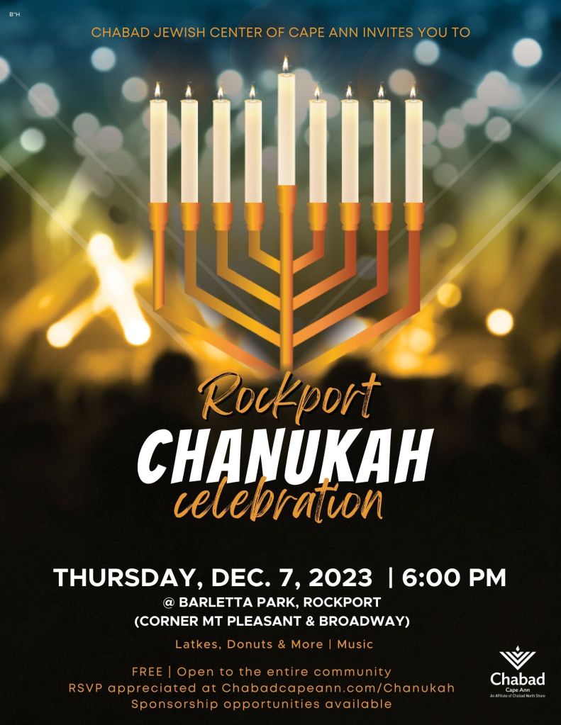 In what has become an annual tradition, Chabad will ignite a public 9-foot Chanukah menorah erected in Downtown Rockport, followed by a community-wide celebration on Thursday, December 7th, the 1st night of the eight-day holiday. The menorah lighting ceremony will include music, Chanukah themed refreshments, such as latkes and doughnuts and children’s activities. Additionally, what started last year and became an annual tradition, there will be a Public Menorah Lighting in Downtown Ipswich followed by a Chanukah party on Sunday, December 10th at 5:00PM.