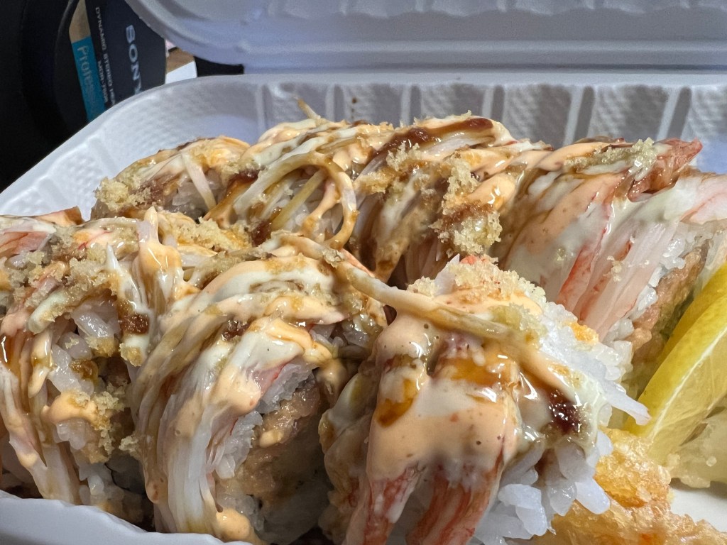 spicy tuna, avocado & shrimp tempura topped with kanikama, spicy mayo, eel sauce, wasabi aioli & tempura flakes