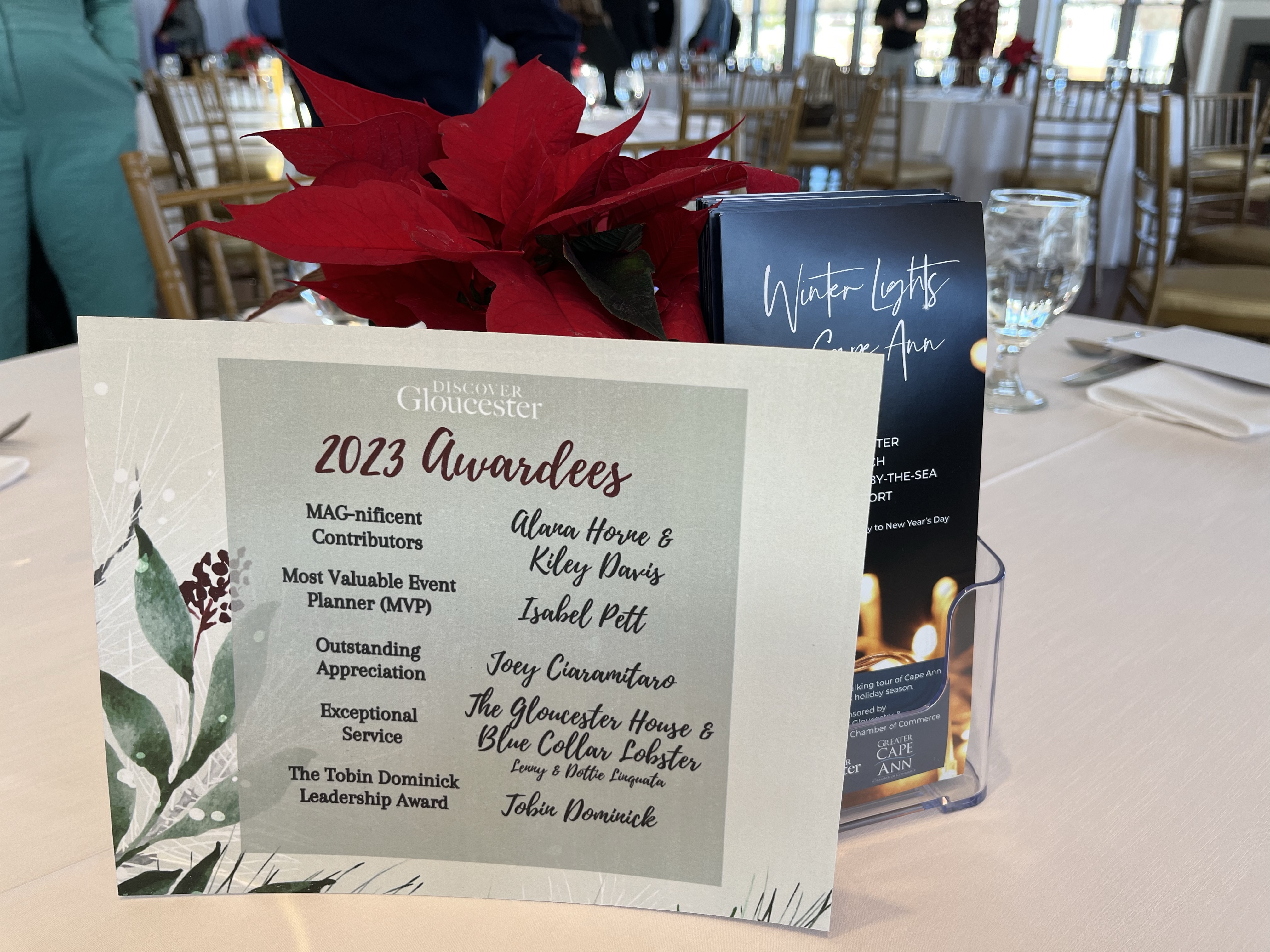 Jim and I were honored to be able to attend the 2023 Holiday Awards Luncheon presented by Discover Gloucester at the Cruiseport yesterday. Five awards were bestowed to a number of Gloucester’s finest promoters: Alana Horne and Kiley Davis (the MAG-nificent Contributors award); Isabel Pett (Most Valuable Event Planner award); Joey Ciaramitaro (Outstanding Appreciation award); The Gloucester House/Blue Collar Lenny and Dottie Linquata (Exceptional Service award); and Tobin Dominick (the Tobin Dominick Leadership award). A number of friends, family members, city representatives and politicians joined Discover Gloucester members to honor the winners. Here’s a few representative photos: