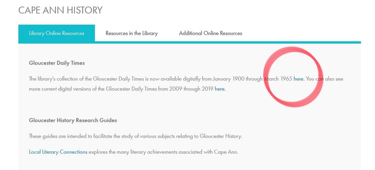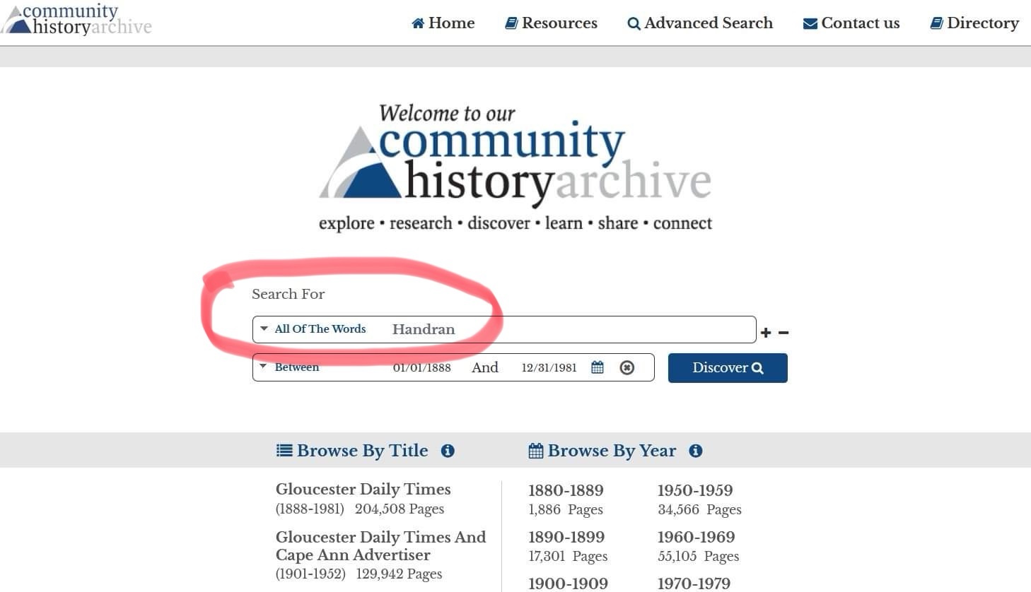 I thought you might benefit from some step by step guidance in case you’d like to do your own research. If you find something cool, please share it! (Carol M I’m talking to you!) First you will search “Sawyer Free Library” for the link. Then you find Cape Ann History Digital Resources on the front page. Select whichever date timeframe interests you (if you select the current dates 2009 forward, you will need your library card number). I selected the older ones and searched the surname Handran.