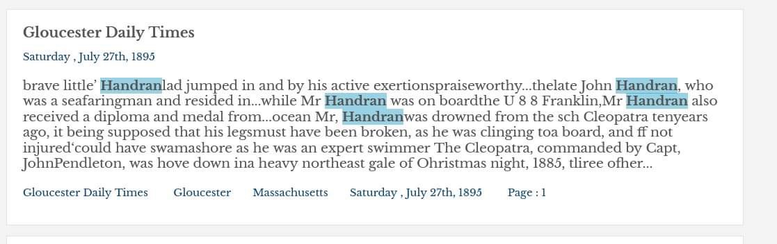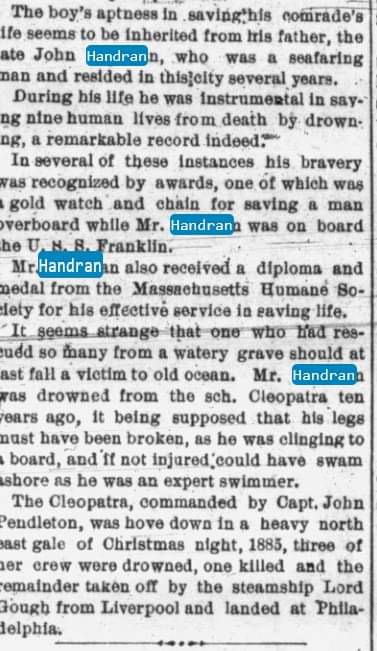 This is how I discovered that John Handran’s 12 year old son Herman saved a child from drowning in Newburyport in 1895. The story titled “A Brave Lad” hightlights the Handran search term and tells a pretty cool story which includes additional proof that we have the right John Handran in our family stories.