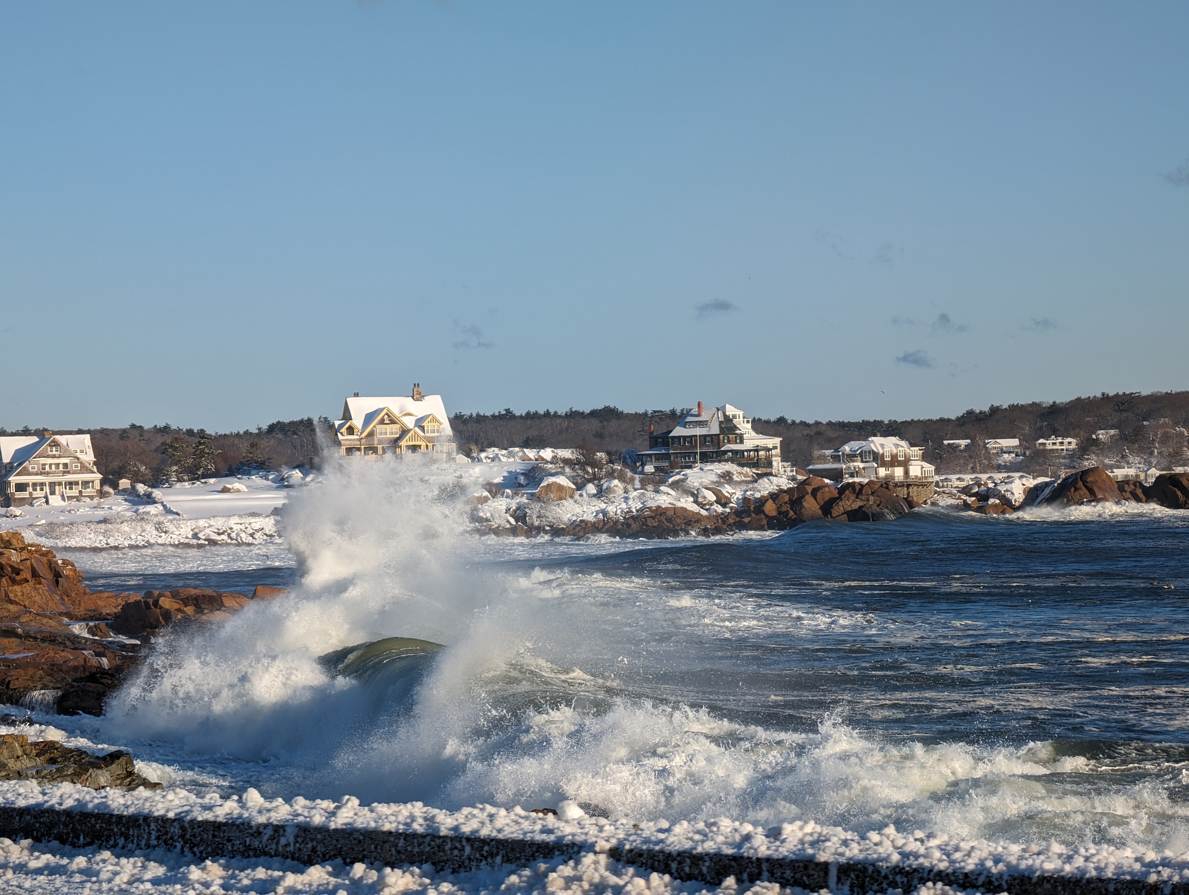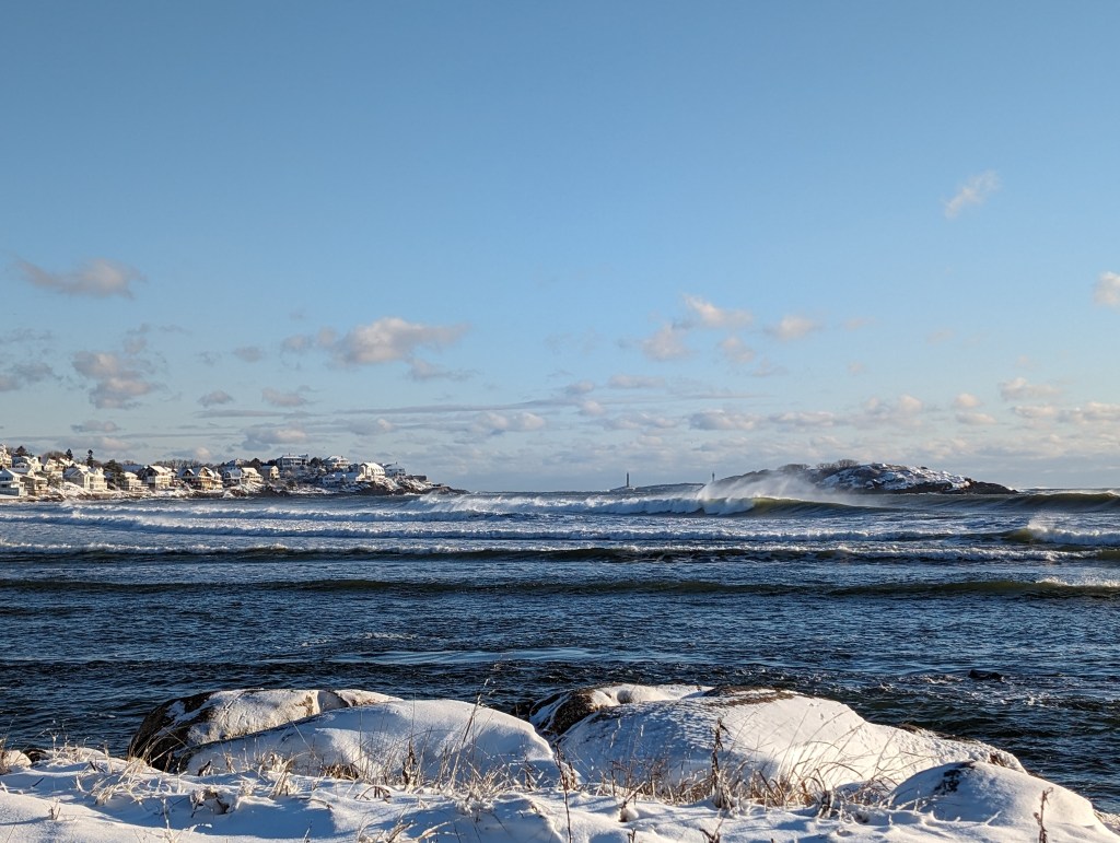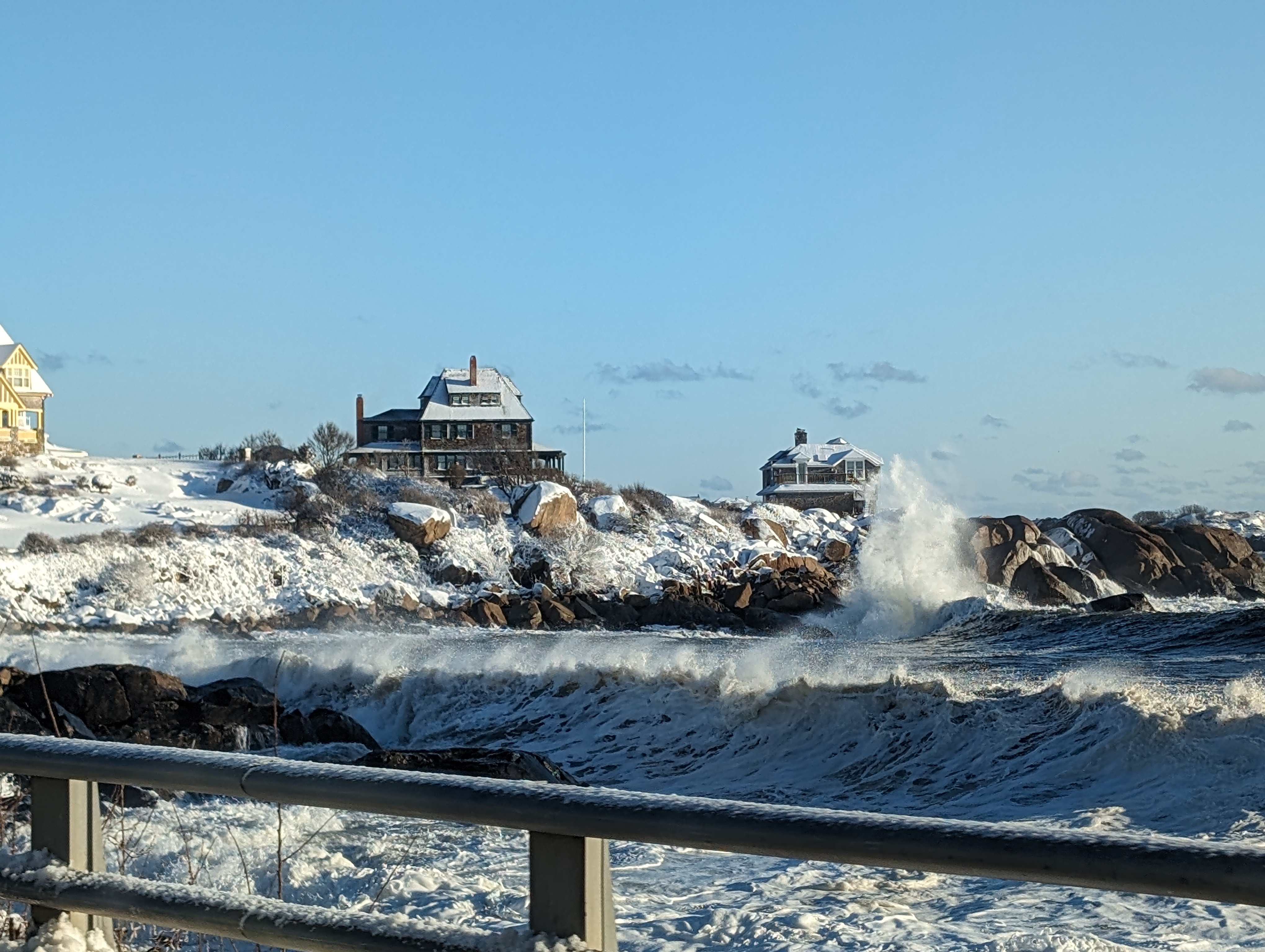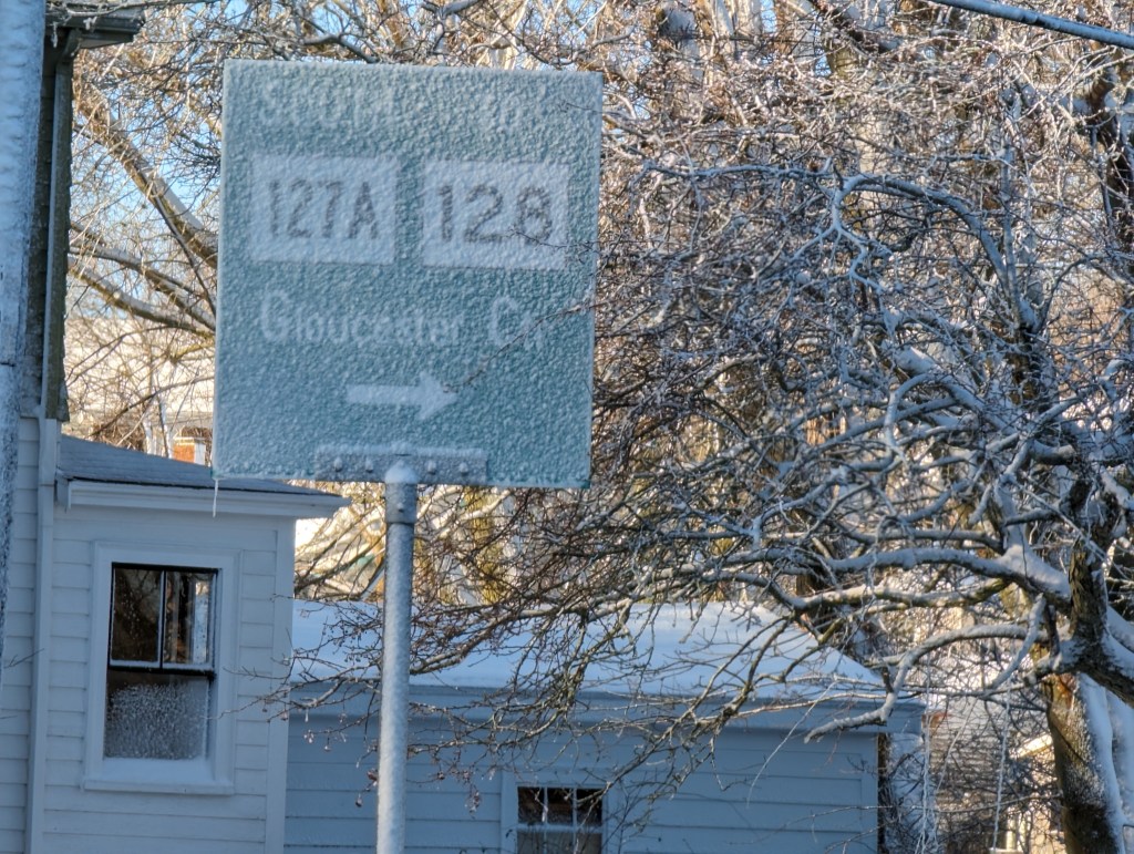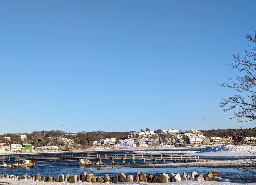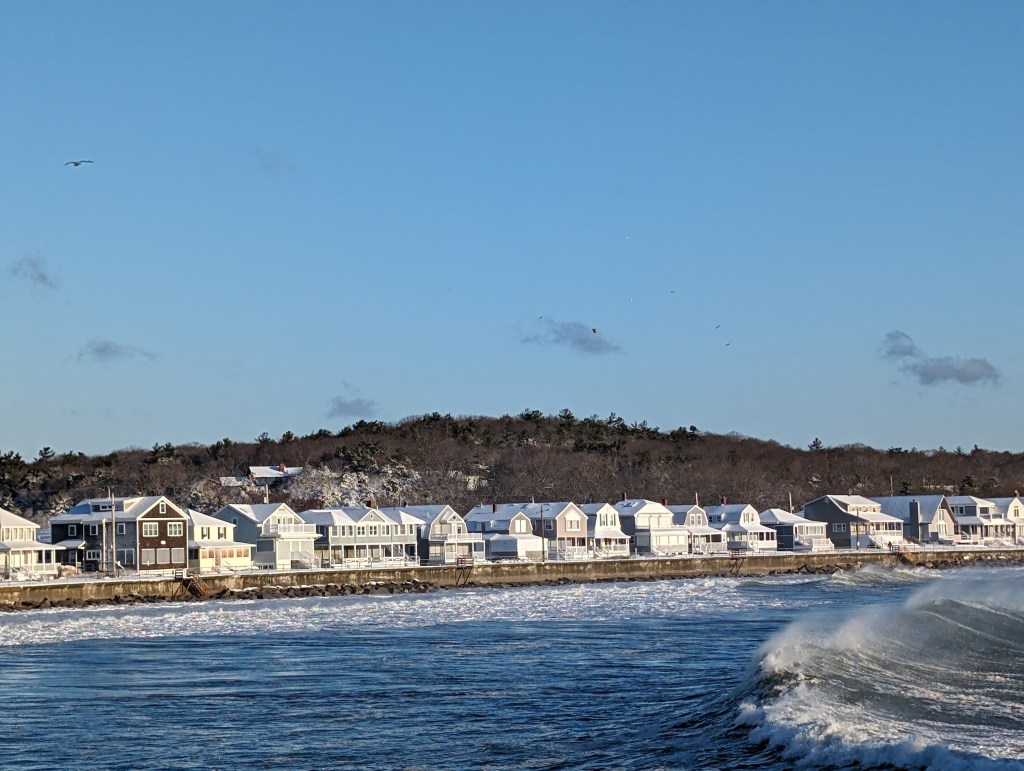 photos: Jan. 8, 2024, Gloucester, Ma. A bright winter morning after the storm. Snow accumulation was enough to enact a 2 hour delay for Gloucester schools. High tide was about 8 AM and windy.