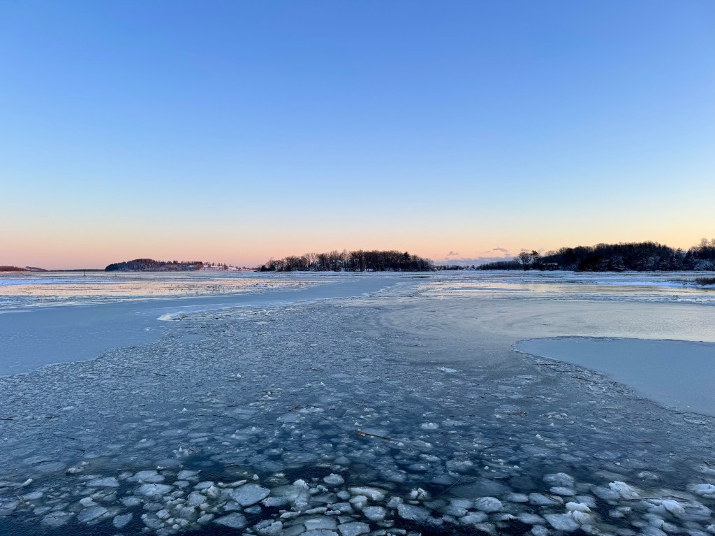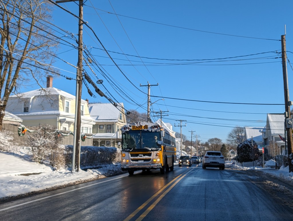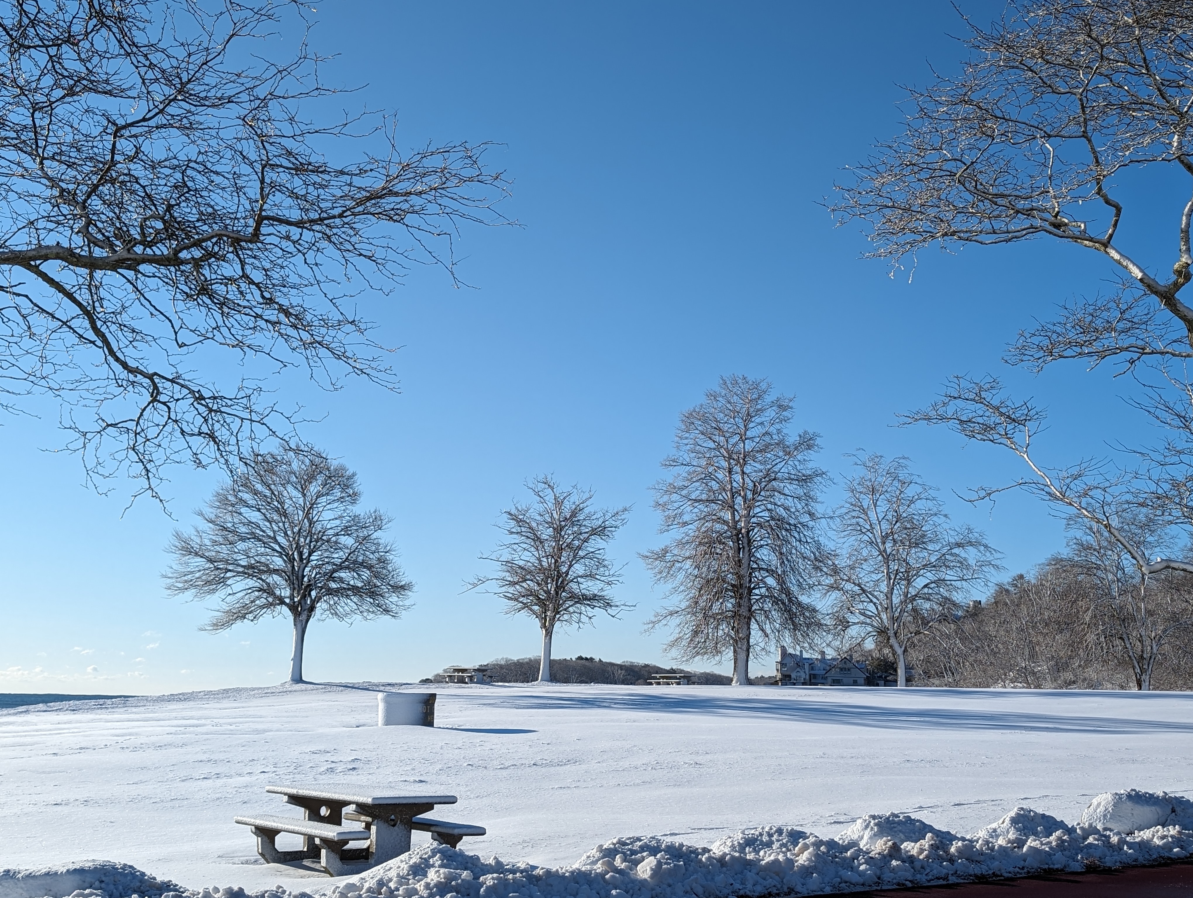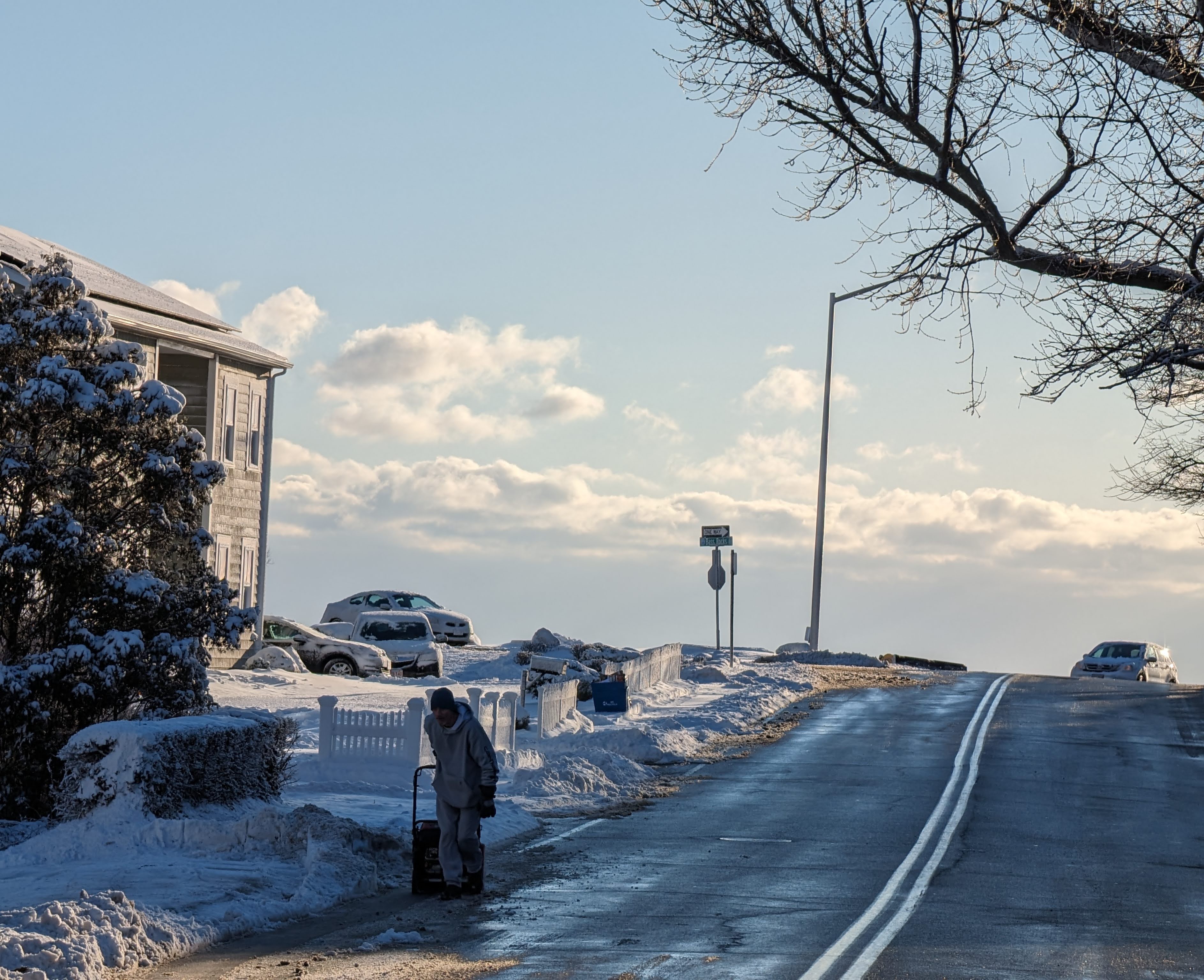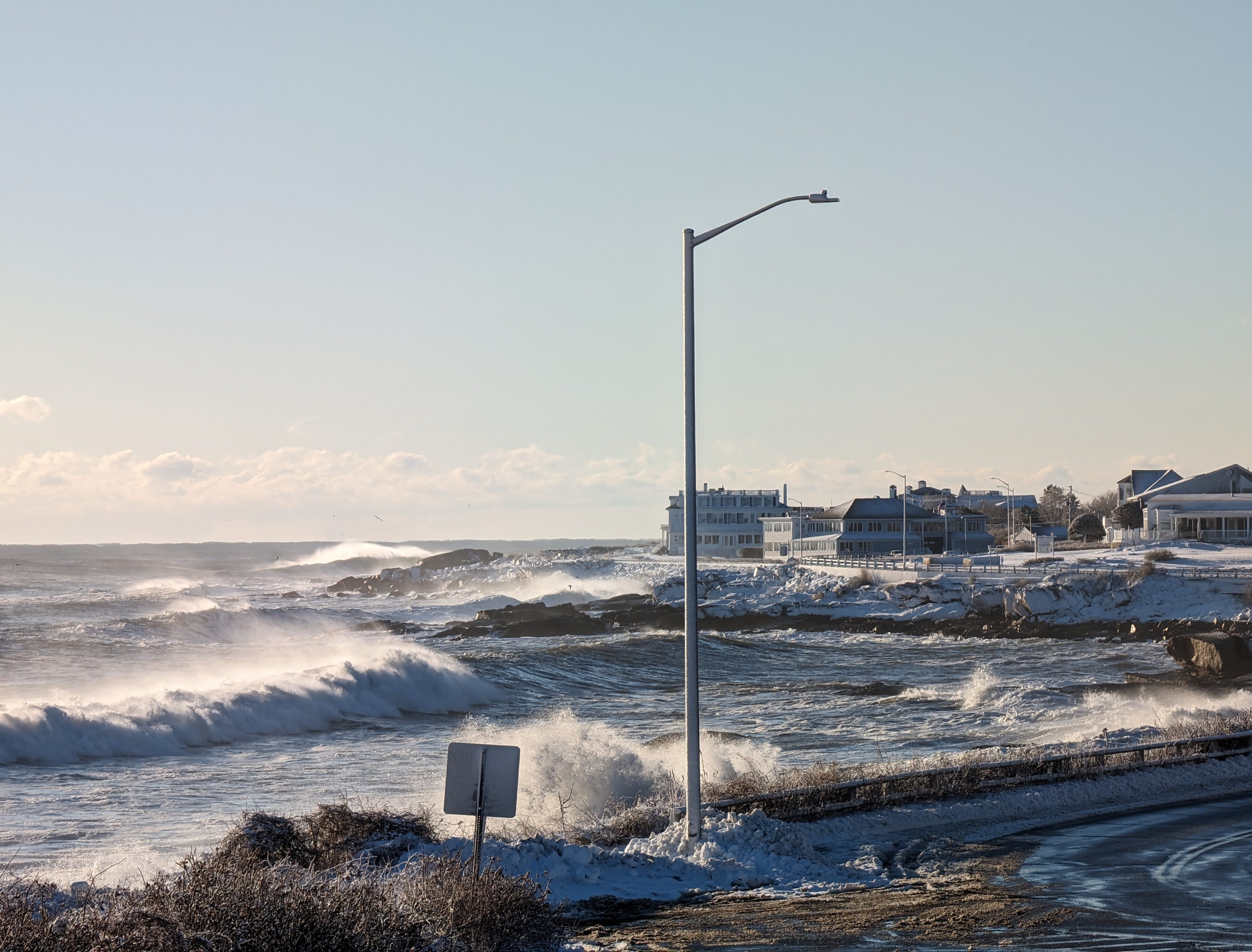 photos: Jan. 8, 2024, Gloucester, Ma. A bright winter morning after the storm. Snow accumulation was enough to enact a 2 hour delay for Gloucester schools. High tide was about 8 AM and windy.