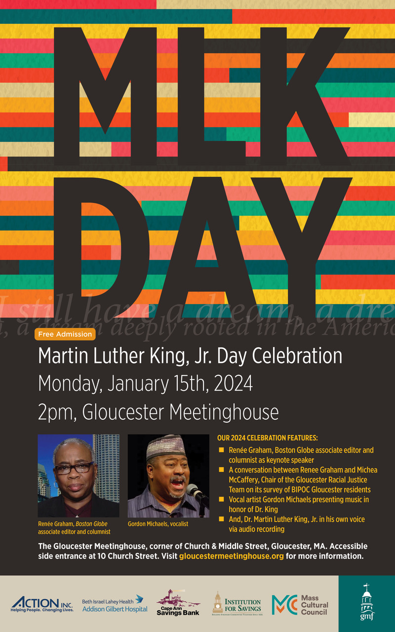 The Martin Luther King holiday is coming up fast! A week from today, Monday January 15th at 2:00pm, the Gloucester Meetinghouse Foundation will host our annual celebration event.