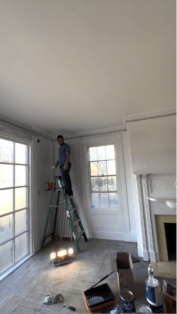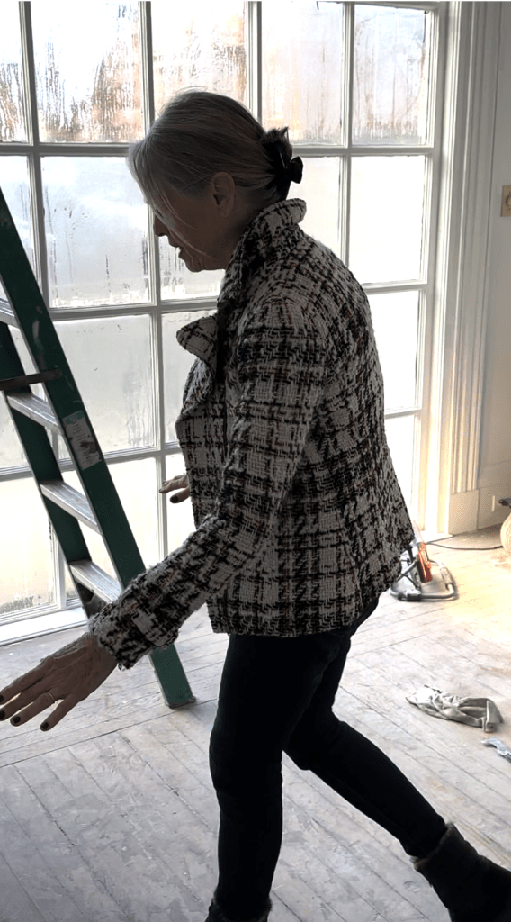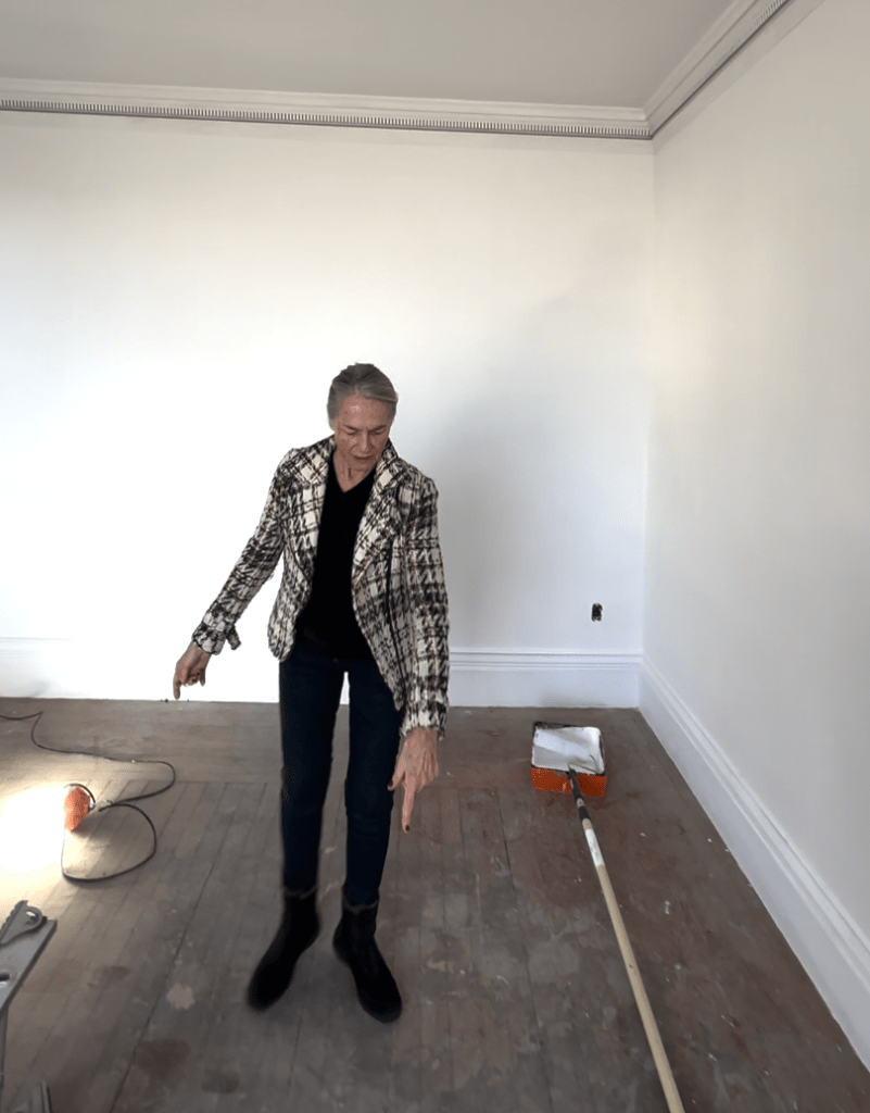 courtesy photos: work in progress towards gallery ready (note extant architectural details: decorative mantle surround, dentil molding, exposed hardwood floor); and Jane in the new space)