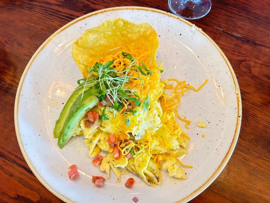 Huevos Rancheros: cheesy jalapeno black bean dip, cheddar, crispy tortilla, pico de gallo, avocado