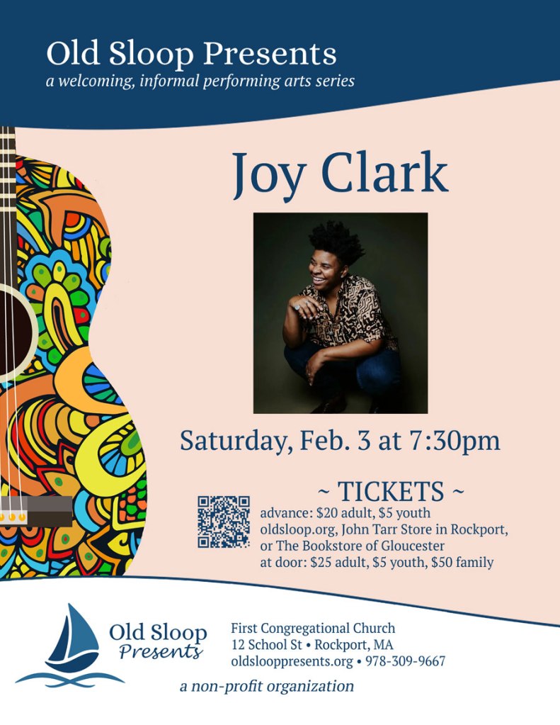 The February 3rd concert features a young woman who Celene and I saw at a Folk Alliance International conference in Kansas City. She impressed us mightily, and we have been looking forward to this show. Her name is Joy Clark, she was born and raised in New Orleans and still lives there, and she’ll be accompanied by two more terrific musicians from New Orleans. The concert page, with more information and links for tickets, is at https://oldslooppresents.org/performance/joy-clark-2024