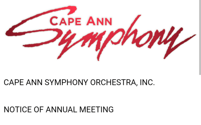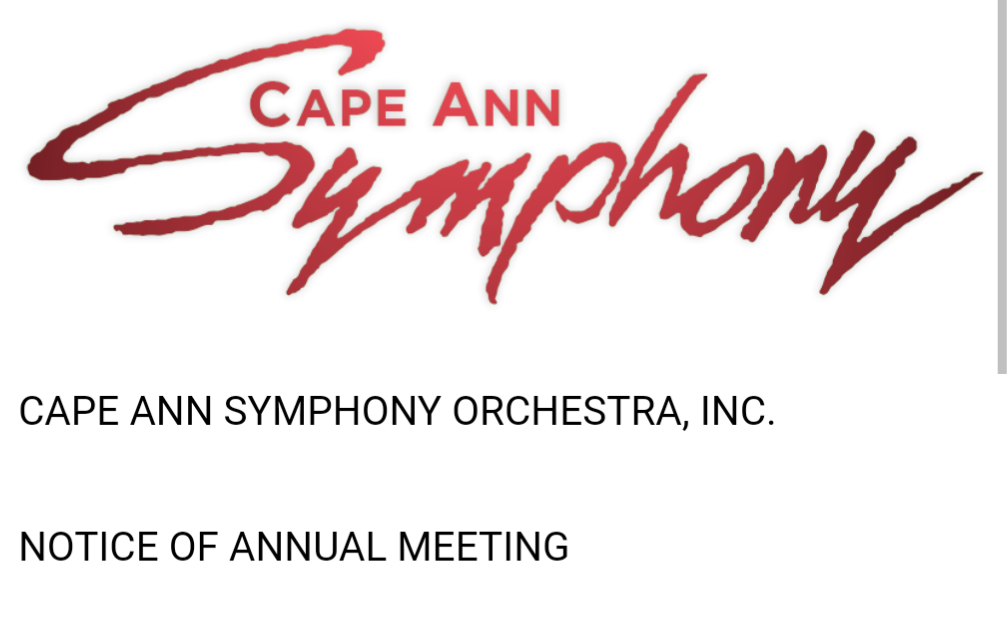 The annual meeting of the Cape Ann Symphony Orchestra, Inc. will be held on Wednesday, January 31, 2024. All regular patrons of the Cape Ann Symphony are welcome to attend. Dinner will be served at 5:30 pm followed by the annual meeting starting at 7:00pm. Dinner will be served restaurant-style and each person will pay for their dinner and gratuity directly to the server.