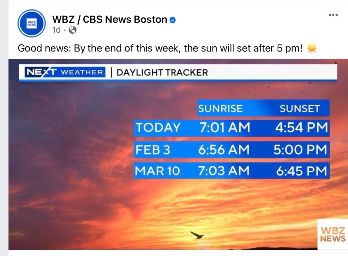 This weather graphic from WBZ was very hopeful to me. We are apparently coming to the end of solar winter, the darkest period of the year. I suppose that’s the reason for Groundhog Day. We will now begin to see earlier sunrises and later sunsets, for which I am very grateful. The darkest period of the year in combination with the recent dreary weather has been challenging for the photographer in me as well for my general outlook. So it may not feel like it, but we are beginning the swing into spring. **Clocks spring forward Mar 10**